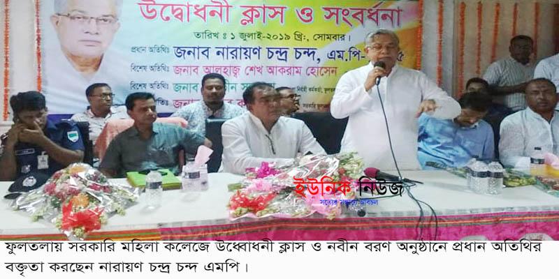 সোমবার বেলা ১১ টায় ফুলতলা সরকারি মহিলা ডিগ্রী কলেজের প্রথম বর্ষে নবীন বরণ অনুষ্ঠানে প্রধান অতিথির বত্তৃতায় তিনি এ কথা বলেন। কলেজ অধ্যক্ষ সমীর কুমার ব্রক্ষ্মার সভাপতিত্বে বিশেষ অতিথি ছিলেন উপজেলা পরিষদের চেয়ারম্যান আলহাজ্ব শেখ আকরাম হোসেন, ওসি মোঃ মনিরুল ইসলাম, জেলা আওয়ামীলীগের সহসভাপতি বিএমএ সালাম, কৃষি বিষয়ক সম্পাদক মোঃ আসলাম খান, উপজেলা সাধারণ সম্পাদক সরদার শাহাবুদ্দিন জিপ্পী। অন্যান্যের মধ্যে উপস্থিত ছিলেন ইউপি চেয়ারম্যান শরীফ মোহাম্মদ ভুইয়া শিপলু, আওয়ামীলীগ নেতা মৃনাল হাজরা, আবু তাহের রিপন, ওয়ার্কার্স পার্টি থানা সম্পাদক গাজী নওশের আলী, মোল্যা হেদায়েত হোসেন লিটু. শাহাদাৎ বিশ্বাস, মনিরুল ইসলাম সরদার, এস কে আলী ইয়াছিন, রবীন বসু প্রমুখ।