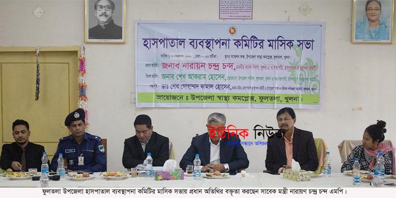 শনিবার সকাল ১০টায় ফুলতলা উপেজলা স্বাস্থ্য কমপ্লেক্সে অডিটোরিয়াম অনুষ্ঠিত উপজেলা স্বাস্থ্য কমিটির মাসিক সভায় প্রধান অতিথির বক্তৃতায় তিনি এ কথা বলেন। উপজেলা স্বাস্থ্য কর্মকর্তা শেখ কামাল হোসেনের সভাপতিত্বে সভায় বিশেষ অতিথি ছিলেন উপজেলা পরিষদের চেয়ারম্যান আলহাজ্ব শেখ আকরাম হোসেন, উপজেলা নির্বাহী অফিসার পারভীন সুলতানা, মুক্তিযোদ্ধা কমান্ডার কাজী জাফর উদ্দিন, ওসি মোঃ মনিরুল ইসলাম। আরএমও ডাঃ মিজানুর রহমানের পরিচালনায় অন্যান্যদের মধ্যে উপস্থিত ছিলেন জেলা আওয়ামালীগ নেতা মোঃ আসলাম খান, উপজেলা আওয়ামীলীগের সাধারণ সম্পাদক সরদার শাহাবুদ্দিন জিপ্পি, ভাইস চেয়ারম্যান কে এম জিয়া হাসান তুহিন, মৃণাল হাজরা, আবু তাহের রিপন, ইউপি চেয়ারম্যান শরীফ মোহাম্মাদ শিপলু ভ্ূঁইয়া, রবিন বসু প্রমুখ। এদিকে হাসপাতাল পরিচালনা কমিটির মিটিং চলাকালে আরএমও ডাঃ মিজানুর রহমানের বদলীর আদেশ স্থগিত’র দাবিতে স্বাস্থ্য কমপ্লেক্স চত্ত্বরে উপজেলাবাসির ব্যানারে হাসপাতালের স্টাফ ও এলাকাবাসি ঘন্টাব্যাপী মানববন্ধন কর্মসূচি পালন করে। পরে এমপি নারায়ণ চন্দ্র চন্দের নিদের্শনায় হাসপাতালে বিরাজমান সমস্যা চিহ্নিত করণ ও নিরসনকল্পে ৩ সদস্য বিশিষ্ট কমিটি গঠিত হয়।