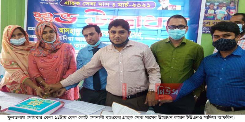 ফুলতলা (খুলনা) প্রতিনিধিঃ সোনালী ব্যাংক ফুলতলা শাখার গ্রাহক সেবা মাসের উদ্বোধনী অনুষ্ঠান সোমবার বেলা ১১টায় ব্যাংক ভবনে শাখা ব্যবস্থাপক শেখ তানভীর রহমানের সভাপতিত্বে অনুষ্ঠিত হয়। অনুষ্ঠানে প্রধান অতিথি ছিলেন ইউএনও সাদিয়া আফরিন। এ সময় অন্যান্যের মধ্যে উপস্থিত ছিলেন সমাজসেবা কর্মকর্তা শাহিন আলম, নির্বাচন কর্মকর্তা কল্লোল বিশ্বাস, বীর মুক্তিযোদ্ধা কমান্ডার কাজী জাফর উদ্দিন, কাজী আশরাফ হোসেন আশু, সমাজসেবক কওছার আলী জমাদ্দার, পল্লী উন্নয়ন কর্মকর্তা আফরুজ্জামান, বীজ কর্মকর্তা মোঃ আনোয়ার হোসেন, হিসাব রক্ষক কর্মকর্তা তাসনিম সুলতানা, প্রেসক্লাব সভাপতি তাপস কুমার বিশ্বাস,সাংবাদিক শেখ মনিরুজ্জামান, উপজেলা প্রেসক্লাব সভাপতি শামসুল আলম খোকন, সহকারী অধ্যাপক মোঃ নেছার উদ্দিন, মুক্তিযোদ্ধা মনজেল সরদার, আঃ গনি বক্স, শিক্ষক মুরাদ হোসেন, ব্যাংক কর্মকর্তা শাহীনা খাতুন, মোঃ জাকারিয়া হোসেন, তপন কুমার সিংহ, কিশোর কুমার রায়, সুদীপ রায়, দেবাশিষ কুমার দে, মোঃ হামিদুর রহমান, মোঃ রিয়াদুল কবির, জ্যোতি প্রকাশ মন্ডল, অনু দত্ত প্রমুখ। পরে কেক কেটে অনুষ্ঠানের আনুষ্ঠানিক উদ্বোধন করা হয়।