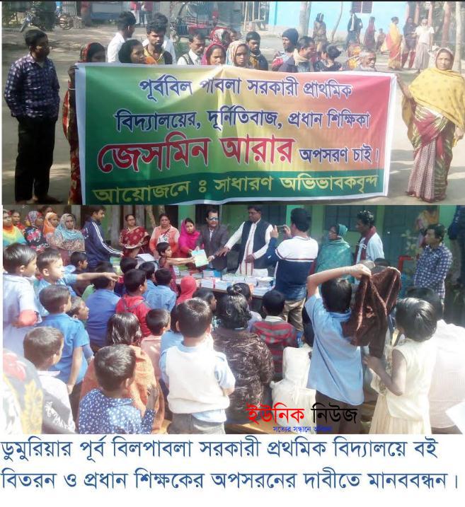 আ: লতিফ মোড়ল, ডুমুরিয়া (খুলনা) : সারা দেশের ন্যায় খুলনার ডুমুরিয়া উপজেলার শিক্ষা প্রতিষ্ঠান গুলোতে উৎসব মুখর পরিবেশে পাঠ্য পুস্তক দিবসে বই বিতরন হলেও একটি সরকারি প্রাথমিক বিদ্যালয়ের প্রধান শিক্ষককে বয়কট ও তার অপসারন দাবীর মধ্যে দিয়ে বই গ্রহন করেছে অভিভাবক ও শিক্ষার্থীরা। ঘটনাটি ঘটেছে গতকাল সোমবার সকালে উপজেলার পূর্ব বিল পাবলা সরকারি প্রাথমিক বিদ্যালয়ে। পরে স্থানীয় ইউপি চেয়ারম্যান ও ম্যানেজিং কমিটির সভাপতি ও সাধারন শিক্ষকদের কাছ থেকে বই গ্রহন করেন শিক্ষার্থী অভিভাবকরা। সংশ্লিষ্ট সূত্রে জানা গেছে, উপজেলার অন্যান শিক্ষা প্রতিষ্ঠানের ন্যায় ডুমুরিয়া উপজেলার পূর্ব বিল পাবলা সরকারি প্রাথমিক বিদ্যালয়ে বই উৎসব পালনের মাধ্যমে বই বিতরনের প্রস্তুুতি নেয়া হয়েছিলো। সেই অনুযায়ী বিদ্যালয়ের কোমল মতি শিক্ষার্থীরা তাদের অভিভাবকদের সাথে নিয়ে সকালেই স্কুলে হাজির হন। কিন্তু বিপত্তি ঘটে স্কুলের দূর্নীতির অভিযোগে অভিযুক্ত প্রধান শিক্ষক জেসমিন আরা কে ১০ মাস পরে স্কুলে হাজির থাকতে দেখে। ক্ষুদ্ধ অভিভাবকরা প্রধান শিক্ষককের অপসারন দাবি করে মানব বন্ধন ও প্রতিবাদ সভা শুরু করে এবং তারা প্রধান শিক্ষকের হাত থেকে বই গ্রহনে অস্বীকৃতি জানান। এক পর্যায়ে স্কুল ম্যানেজিং কমিটির সভা পতি বিষয়টি উপজেলা শিক্ষা অফিস,¯হানীয় ইউপি চেয়ারম্যানসহ বিভিন্ন দপ্তরকে অবহিত করেন। পরে ¯হানীয় ইউপি চেয়ারম্যান মোস্তফা সরোয়ার ও কেএমপি’র আড়ংঘাটা থানার এস,আই সবুজ সংগীয় ফোর্স নিয়ে ঘটনা ¯হলে যেয়ে পরি¯িহ শান্ত করেন। সাধারন অভিভাবকরা প্রধান শিক্ষককে বাদ দিয়ে চেয়ারম্যান ও সভার অন্যান ব্যক্তিদের হাত থেকে বই নিতে সম্মত হলে বই বিতরন করা হয়। এ প্রসঙ্গে স্কুল ম্যানেজিং কমিটির সভাপতি দেবাশীষ মন্ডল জানান, প্রধান শিক্ষক জেসমিন আরা’র বিরুদ্ধে ছাত্রীদের দিয়ে মাথার উঁকুন বাছানো, কমিটিকে না জানিয়ে স্কুলের পুরাতন বই,খাতা,রেজিষ্টার স্বেচ্ছা চারী মুলক ভাবে বিক্রি করে অর্থ আত্মসাৎ করা, অনিয়ম তান্ত্রিক ভাবে স্কুলে যাওয়া- আসা, সহকারি শিক্ষক ও শিক্ষার্থীদের সাথে অসৌজন্য মুলক আচারন সহ বিভিন্ন অভিযোগ এনে গত বছর ২২ শে ফেব্র“য়ারী স্কুল ম্যানেজিং কমিটির সদস্য,সাধারন অভিভাবক,সহকারি শিক্ষকবৃন্দ উপজেলা শিক্ষা কর্মকর্তার কাছে লিখিত অভিযোগ দায়ের করেন। অভিযোগের প্রেক্ষিতে ৩ জন উপজেলা সহকারি শিক্ষা কর্মকর্তা গত বছর ৪ঠা মার্চ অভিযোগ তদন্ত করে রিপোর্ট জমা দেন। তদন্তে প্রধান শিক্ষের বিরুদ্ধে আনীত অভিযোগের সত্যতা পাওয়া যাওয়ায় উপজেলা শিক্ষা অফিস ব্যব¯হা গ্রহনের জন্যে উর্ধতন কর্তৃপক্ষের কাছে সুপারিশ পাঠান। পরবর্তিতে প্রধান শিক্ষকের বিরুদ্ধে উত্থাপিত উল্লেখি