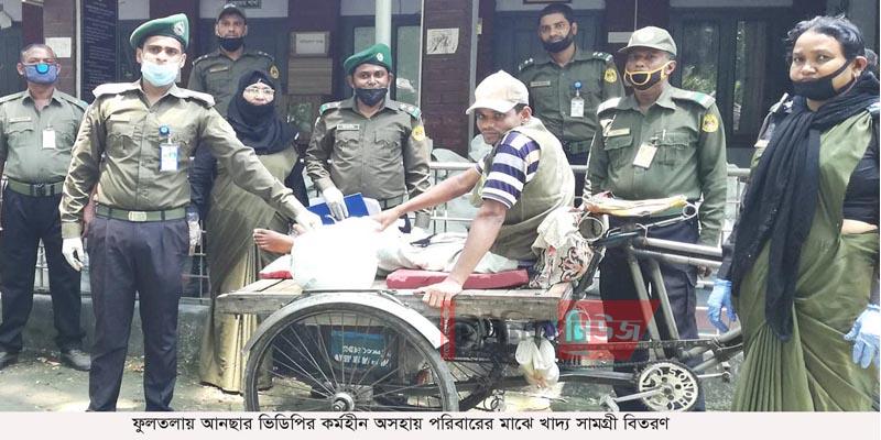 ফুলতলা (খুলনা) প্রতিনিধিঃ ফুলতলা উপজেলা আনসার ভিডিপির উদ্যোগে শনিবার বেলা ১১টায় উপজেলা পরিষদ চত্বরে করোনা ভাইরাসের কারণে শারীরিক দুরত্ব বজায় রেখে আনসার ভিডিপির কর্মহীন ৩শ’ অসহায় পরিবারের মাঝে খাদ্য সামগ্রী বিতরণ করা হয়। এ সময় অন্যান্যের মধ্যে উপস্থিত ছিলেন উপজেলা আনসার ভিডিপি কর্মকর্তা মোঃ আশিকুর রহমান, প্রশিক্ষক নুরুন্নেছা খানম, জাহাঙ্গীর আলম শরীফ, দলনেতা আবুল খায়ের, নাসির উদ্দিন, আলমগীর হোসেন, সুফিয়া ইয়াসমিন, শফিকুল ইসলাম, হাবিবুর রহমান প্রমুখ। প্রদত্ত খাদ্য সামগ্রীর মধ্যে ছিল ৫ কেজি চাল, ২ কেজি আলু, ১ কেজি করে ডাল, পিয়াজ ও তেল এবং ১টি সাবান ও মাস্ক।