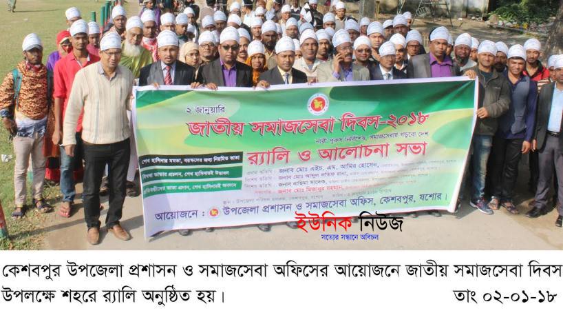 কেশবপুর (যশোর) প্রতিনিধি : যশোরের কেশবপুর উপজেলা প্রশাসন ও সমাজসেবা অফিসের আয়োজনে জাতীয় সমাজসেবা দিবস-২০১৮ উপলক্ষে ২ জানুয়ারি সকালে র্যালি ও আলোচনা সভা অনুষ্ঠিত হয়েছে। উপজেলা নির্বাহী অফিসার মোঃ মিজানূর রহমানের সভাপতিত্বে ও উপজেলা সমাজসেবা অফিসার তরিকুল ইসলামের সঞ্চালনায় উপজেলা পরিষদ চত্ত্বরে অনুষ্ঠিত আলোচনা সভায় প্রধান অতিথির বক্তব্য রাখেন উপজেলা চেয়ারম্যান এইচ এম আমির হোসেন। বিশেষ অতিথির বক্তব্য রাখেন ভাইস চেয়ারম্যান আব্দুল লতিফ রানা, কেশবপুর সদর ইউপি চেয়ারম্যান অধ্যাপক আলাউদ্দীন আলা ও কেশবপুর উপজেলা প্রেসক্লাবের সভাপতি এস আর সাঈদ। অন্যান্যের মধ্যে উপস্থিত ছিলেন উপজেলা স্বাস্থ্য ও পরিবার পরিকল্পনা অফিসার ডাঃ শেখ আবু শাহীন, শিক্ষা অফিসার আকবর হোসেন, কৃষি অফিসার মহাদেব সানা, সমবায় অফিসার নজরুল ইসলাম, শিশু বিষয়ক অফিসার বিমল কুমার কুন্ডু, নির্বাহী প্রকৌশলী মুনছুর আলী, মহিলা বিষয়ক অফিসার কানিজ ফাতেমা শেফা, মৎস্য অফিসার এম এম আলমগীর কবীর, কৃষি সম্প্রসারণ অফিসার মনির হোসেন, সহকারী কৃষি সম্প্রসারণ অফিসার আব্দুল মান্নান, উপজেলা আওয়ামী লীগের সাংগঠনিক সম্পাদক গৌতম রায়, ওয়ার্ডের নির্বাহী পরিচালক সৈয়দ আকমল আলী, উন্নয়নের আব্দুর রহিম, সমাধানের মুনছুর আলী প্রমুখ।
