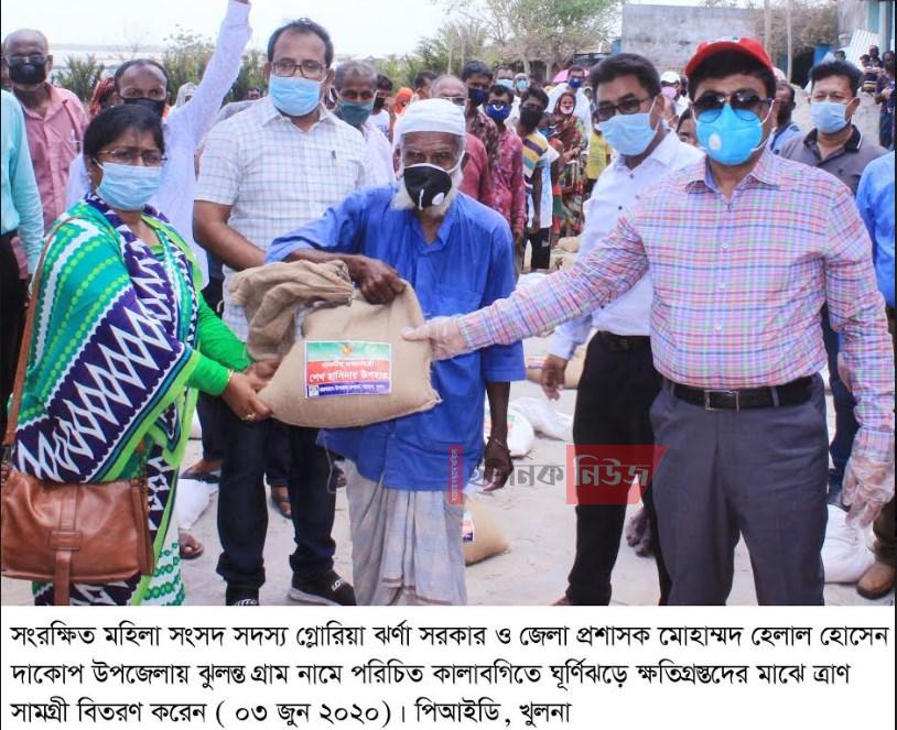 খুলনা অফিস : খুলনার উপকূলীয় উপজেলা দাকোপে ঘূর্ণিঝড় আম্পানে ক্ষতিগ্রস্তদের মাঝে খুলনা জেলা প্রশাসন ত্রাণ সামগ্রী বিতরণ করে। জেলা প্রশাসক মোহাম্মদ হেলাল হোসেন সংরক্ষিত মহিলা সংসদ সদস্য গ্লোরিয়া ঝর্ণা সরকারকে সাথে নিয়ে আজ (বুধবার) সারাদিন দাকোপ উপজেলায় ঝুলন্ত গ্রাম নামে পরিচিত কালাবগি ও নলিয়ান এলাকা সরেজমিনে পরিদর্শন করেন এবং ক্ষতিগ্রস্তদের মাঝে ত্রাণ সামগ্রী বিতরণ করেন।