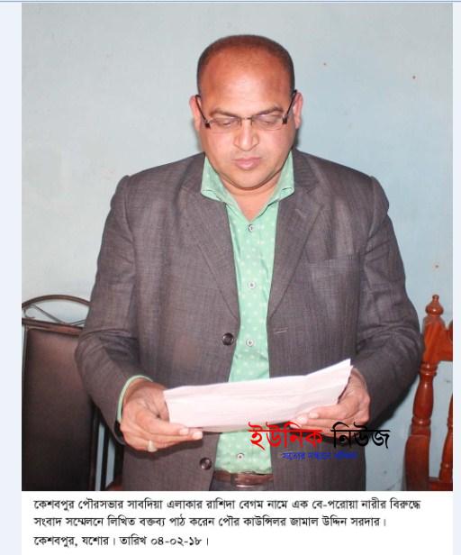 কেশবপুর উপজেলা প্রেসক্লাবের রবিবার দুপুরে সংবাদ সম্মেলনে পৌর আওয়ামী লীগের যুগ্ম-আহ্বায়ক ও পৌরসভার ৩ নং ওয়ার্ড কাউন্সিলর জামাল উদ্দিন সরদার লিখিত বক্তব্য পাঠকালে বলেন, পৌরসভার সাবদিয়া গ্রামের পৌর বিএনপিনেতা করিম মোড়লের স্ত্রী রাশিদা বেগম সম্প্রতি সরকারী জমি দখল করে পাঁকা ভবন নির্মান কালে তিনি ও এলাকাবাসি সম্মিলিতভাবে বাধা প্রদান করলে তার বিরুদ্ধে সে থানায় একটি মিথ্যা অভিযোগ করে। থানা তদন্ত ওসি শাহাজাহান আহম্মেদ বিষয়টি তদন্ত করে কোন সত্যতা পায়নি। তখন থেকে রাশিদা বেগম আমাকে সায়েস্তা করার করার ঘোষণা দেয়। তার প্রেক্ষিতে গত ৩ ফেব্রুয়ারী আমার বিরুদ্ধে ভূয়া মাতৃত্ব ভাতার কার্ড তৈরী করে লক্ষ লক্ষ টাকা আত্নসাতের অভিযোগ ও চাঁদাবাজির কাল্পনিক অভিযোগ এনে সংবাদ সম্মেলন করে। অথচ সরকারীভাবে তদন্ত ছাড়া মাতৃত্ব ভাতার কার্ড তৈরীর কোন সূযোগ নেই। আত্নসাত ও চাঁদাবাজির কোন প্রশ্নই ওঠে না। যে মিথ্যা, বানোয়াট ও ভিত্তিহীন সংবাদ কয়েকটি পত্রিকায় প্রকাশিত হয়। তিনি প্রকাশিত সংবাদের তীব্র নিন্দা ও প্রতিবাদ জানান। তিনি রাশিদা বেগমের বিরুদ্ধে অনৈতিক কর্মকান্ডের অভিযোগ তোলেন। তাছাড়া রাশিদা বেগম পৌরসভার ৩ নং ওয়ার্ডের সাবেক কাউন্সিলর সাখাওয়াত হোসেন ও আঃ বারিক সরদারের পূত্র আঃ জলিলের বিরুদ্ধে আদালতে ধর্ষণ মামলা দিয়ে হয়রানি করে। মামলার ভয়ে তার বিরুদ্ধে এলাকার কেউ মুখ খুলতে সাহস পায় না। রাশিদা বেগম তার স্বামী আব্দুল করিমকে ছাড়া পৃথকভাবে বসবাস করায় তিনি ২য় বিবাহ করেছেন। বর্তমানে রাশিদা বেগম তার বিরুদ্ধে নানামুখি ষড়যন্ত্রে লিপ্ত রয়েছে। সংবাদ সম্মেলনের মাধ্যমে তিনি প্রশাসনের সুদৃষ্টি কামনা করেছেন।