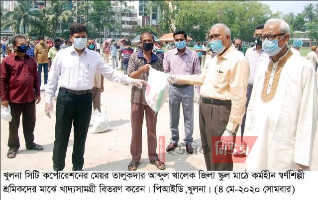 খুলনা অফিস : খুলনা জেলা প্রশাসনের উদ্যোগে ‘বেসরকারি মানবিক সহায়তা সেল’-এর আওতায় করোনাভাইরাস সংক্রমণ প্রতিরোধে নিম্নআয়ের তিনশত ২১ কর্মহীন স্বর্ণশিল্পী শ্রমিকদের মাঝে আজ (সোমবার) সকালে খুলনা জিলা স্কুল মাঠে সাত কেজি করে চাল এবং সবজিসহ খাদ্যসামগ্রী বিতরণ করা হয়। খুলনা সিটি কর্পোরেশনের মেয়র তালুকদার আব্দুল খালেক এসব খাদ্যসামগ্রী বিতরণ করেন।