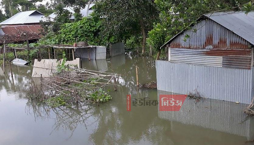 গাইবান্ধা প্রতিনিধি : গাইবান্ধার ব্রহ্মপুত্র ও ঘাঘট নদীর পানি কমতে শুরু করলেও বন্যা পরিস্থিতি এখনও অপরিবির্তত রয়েছে। এছাড়া বন্যার পানি বৃদ্ধির সঙ্গে সঙ্গে নদী ভাঙনও তীব্র আকার ধারণ করেছে। শনিবার ব্রহ্মপুত্রের পানি বিপৎসীমার ৬৬ সে.মি. ও ঘাঘট নদীর পানি বিপৎসীমার ৩১ সে.মি. উপর দিয়ে প্রবাহিত হয়। এদিকে বন্যা নিয়ন্ত্রন বাঁধ বা উঁচু স্থানে আশ্রিত বানভাসি মানুষ এবং বন্যা কবলিত এলাকার বসতবাড়িতে অবস্থানকারি পানিবন্দী মানুষদের শুকনা খাবার, বিশুব্ধ পানি, পয়:নিস্কাশন সমস্যা ও গো-খাদ্যের সংকট দেখা দিয়েছে । জেলার সুন্দরগঞ্জ, সাঘাটা, ফুলছড়ি ও সদর উপজেলার ২৬টি ইউনিয়ন বন্যা কবলিত হয়ে পড়ায় ১ লাখ ২২ হাজার ৩২০ জন ক্ষতিগ্রস্ত হয়েছে। বন্যা দুর্গত মানুষের জন্য এ পর্যন্ত ২শ’ মে. টন চাল ও ১৩ লাখ টাকা সরকারি বরাদ্দ দেয়া হয়েছে। বন্যা দুর্গত ৪টি উপজেলায় ৬১টি মেডিকেল টিম কাজ করছে। এদিকে কৃষি বিভাগ সুত্রে জানা গেছে, এ পর্যন্ত ফসলসহ প্রায় ২ হাজার হেক্টর জমি পানিতে নিমজ্জিত হয়েছে। এতে চিনা বাদাম, আউশ ধান ও পাটের ব্যাপক ক্ষতি হয়েছে। বন্যার ক্ষতি পুষিয়ে নিতে ইতোমধ্যে কৃষি বিভাগ ১শ’ ৫ একর উঁচু জমিতে বীজতলা তৈরী করেছে। যা বন্যায় ক্ষতিগ্রস্ত কৃষকদের মধ্যে বিনামূল্যে বিতরণ করা হবে। অন্যদিকে সাঘাটার হলদিয়ার ৪৪ বছরের পুরান স্কুলটি নদীগর্ভে বিলীন গাইবান্ধায় সাঘাটা ও ফুলছড়ি উপজেলায় ব্যাপক নদী ভাঙনে বিপন্ন মানুষ নদী ভাঙনে ॥ সাড়ে ৫ হাজার পরিবার নতুন করে ভাঙন কবলিত হয়েছে। টানা বর্ষণ আর উজানের ঢলে সৃষ্ট বন্যার পানি কমতে থাকায় গাইবান্ধার সাঘাটা ও ফুলছড়ি উপজেলার নদী ভাঙন তীব্র ভাঙন আকার ধারণ করেছে। এতে প্রায় সাড়ে ৫ হাজার পরিবার ভাঙন কবলিত হওয়ায় মানবেতর জীবন যাপন করছে। ইতোমধ্যে যমুনা নদীগর্ভে বিলিন হয়েছে ১৯৭৬ সালে প্রতিষ্ঠিত গাইবান্ধার সাঘাটা উপজেলার গোবিন্দপুর উচ্চ বিদ্যালয়ের ভবনটি। এছাড়া ভাঙনের হুমকিতে রয়েছে আশেপাশের দু’শতাধিক বসতবাড়ী। ফলে ভাঙন কবলিত মানুষ দ্রুত তাদের বাড়িঘর সরিয়ে অন্যত্র আশ্রয় নিতে বাধ্য হচ্ছে। উল্লেখ্য, গত ২৪ ঘন্টায় গোবিন্দপুর উচ্চ বিদ্যালয়ের মাঠসহ দু ৩৯ টি শ্রেণি কক্ষ নদীগর্ভে বিলিন হয়েছে। যে কোন সময় সম্পূর্ণ ভবনটি নদীতে বিলিন হতে পারে আশংকায় বিদ্যালয় কর্তৃপক্ষ বাকি শ্রেণি কক্ষগুলোর টিনের চাল, চেয়ার, টেবিল ও বেঞ্চসহ অন্যান্য সরঞ্জাম দ্রুত অন্যত্র সরে নিয়ে যাচ্ছে। এদিকে ফুলছড়ি উপজেলার বিভিন্ন পয়েন্টে ব্যাপক নদী ভাঙন অব্যাহত রয়েছে। ভাঙনে চরম হুমকির সম্মুখীন হয়ে পড়েছে এরেন্ডাবাড়ী ইউনিয়নের জিগাবাড়ী উচ্চ বিদ্যালয়, সরকারি প্রাথমিক বিদ্যালয়, একটি বাজার, নুরানী হাফিজিয়া মাদ্রাসা, ঈদ