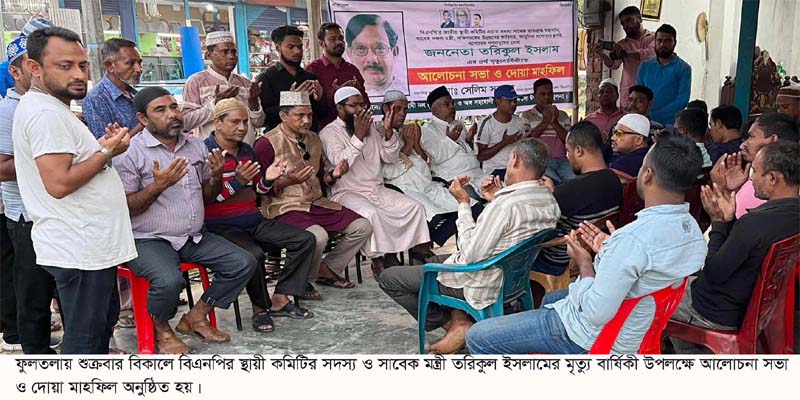 ফুলতলা (খুলনা) প্রতিনিধি// বিএনপির স্থায়ী কমিটির সদস্য ও সাবেক মন্ত্রী তরিকুল ইসলামের চতুর্থ মৃত্যু বার্ষিকী পালন উপলক্ষে ফুলতলা উপজেলা বিএনপির উদ্যোগে শুক্রবার বিকালে স্থানীয় প্রেমা গ্রাউন্ড চত্বরে আলোচনা সভা ও দোয়া মাহফিল অনুষ্ঠিত হয়। উপজেলা বিএনপির সিনিয়র যুগ্ন আহবায়ক মোঃ সেলিম সরদারের সভাপতিত্বে অনুষ্ঠানে প্রধান অতিথি ছিলেন খুলনা জেলা বিএনপির সদস্য হাসনাত রেজভী মার্শাল। প্রধান আলোচক ছিলেন উপজেলা বিএনপির যুগ্ন আহবায়ক মনির হাসান টিটো। অন্যান্যের মধ্যে উপস্থিত ছিলেন বিএনপি নেতা মোঃ মশিউর রহমান বিপ্লব, হালিম সরদার, আনিছুর রহমান পলাশ, জিএম শফিকুল ইসলাম, মোঃ ইদ্রিস আলী মোল্যা, শেখ হাফিজুর রহমান, মাফিজুর জমাদ্দার, আনোয়ার হোসেন, মোঃ সিরাজুল ইসলাম মোড়ল, আয়ুব মোল্যা, ইকবাল খাঁন, মোতাহার হোসেন কিরণ, আকবর সরদার, মোঃ হারুন মোল্যা, মাসুম শেখ, জাকারিয়া হোসেন, যুবনেতা রবিউল ইসলাম রবি, শাহিন আজাদ, তুহিন খন্দকার, ইনামুল কবির হিরোন, হুসাইন মোহাম্মদ মহাসিন, সৈয়দ আল শাকিল, শাহিন সরদার, হাবিব মোল্যা, জাহিদ শেখ, ইকবাল মোল্যা, ছাত্রনেতা মোঃ ফয়সাল হোসেন, সাকিব সরদার প্রমুখ। পরে প্রয়াত নেতার আত্মার মাগফেরাত কামনা করে দোয়া অনুষ্ঠান পরিচালনা করেন মাওঃ মোঃ ইমরান হুসাইন।