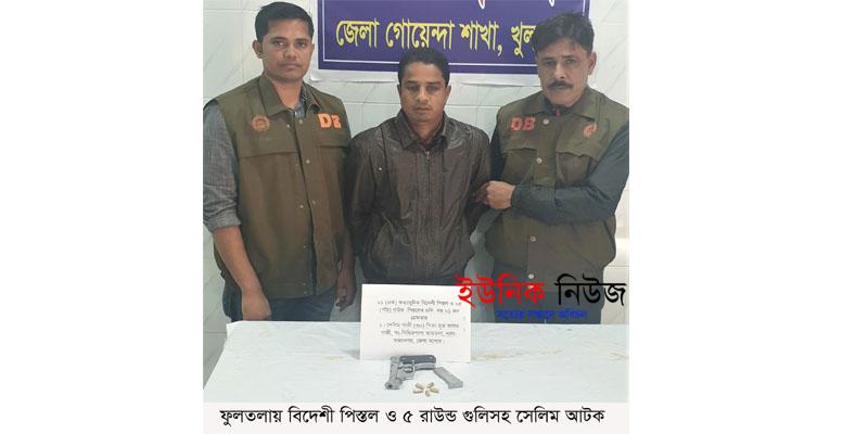 পুলিশ জানায়, জেলা গোয়েন্দা পুলিশের ওসি তোফায়েল আহমেদ, পরিদর্শক সেখ কনি মিয়া ও এসআই মুক্তরায় চৌধুরী নেতৃত্বে স্বাস্থ্য কমপ্লেক্স ঘাট এলাকায় অভিযান চালায়। এ সময় সন্দেহভাজন ৩ যুবককে চ্যালঞ্জ করলে তারা পালিয়ে যাওয়ার চেষ্টাকালে সেলিম গাজীকে আটক করলেও অপর দুই যুবক পালিয়ে যায়। পরে সেলিম গাজীর দেহ তল্লাসী চালিয়ে ১টি বিদেশী অত্যাধুনিক পিস্তল ও ৫ রাউন্ড গুলি উদ্ধার করা হয়। এ ব্যাপারে ওসি তোফায়েল আহমেদ বাদি হয়ে ফুলতলা থানায় মামলা দায়ের করেন। গতকাল সেলিম গাজীকে আদালতে সোপর্দ করে জিজ্ঞাসাবাদের জন্য ৫ দিনের রিমান্ডাবেদন জানানো হয়েছে।