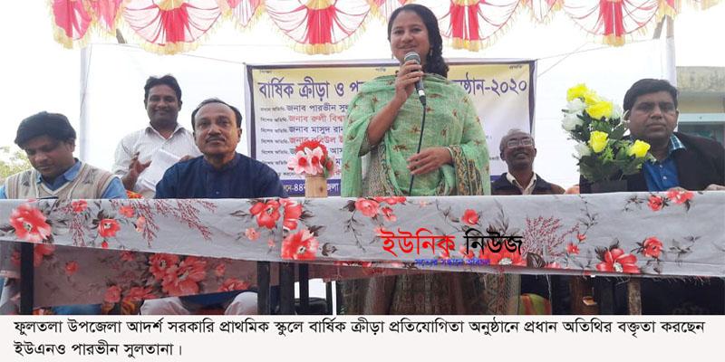 বিশেষ প্রতিনিধি খুলনাঃ ফুলতলা উপজেলা আদর্শ সরকারি প্রাথমিক বিদ্যালয়ে বার্ষিক ক্রীড়া প্রতিযোগিতা ও পুরস্কার বিতরণী অনুষ্ঠান বুধবার বিকালে স্কুল মাঠে অনুষ্ঠিত হয়। স্কুল পরিচালনা কমিটির সহ-সভাপতি কামরুজ্জামান নান্নুর সভাপতিত্বে অনুষ্ঠানে প্রধান অতিথি ছিলেন ইউএনও পারভীন সুলতানা। বিশেষ অতিথি ছিলেন সহকারী কমিশনার (ভুমি) রুলী বিশ্বাস, উপজেলা ক্রীড়া সংস্থার সাধারণ সম্পাদক শিল্পপতি মোঃ হুমায়ুন আহমেদ ভুইয়া, ভারপ্রাপ্ত শিক্ষা অফিসার মাসুদ রানা, উপজেলা রিসোর্স কর্মকর্তা রবিউল ইসলাম রনি, সহকারী শিক্ষা কর্মকর্তা মোঃ আসাদুজ্জামান। স্বাগত বক্তৃতা করেন প্রধান শিক্ষক প্রদীপ কুমার কুন্ডু। শিক্ষক মোঃ ইউসুফ আলীর পরিচালনায় অন্যান্যের মধ্যে বক্তৃতা করেন সহকারী অধ্যাপক মোঃ নেছার উদ্দিন, মারুফা সুলতানা, দীপজয় কুমার, বিকু ভুইয়া প্রমুখ। পরে অতিথিবৃন্দ বিজয়ী শিক্ষার্থীদের মাঝে পুরস্কার বিতরণ করেন।