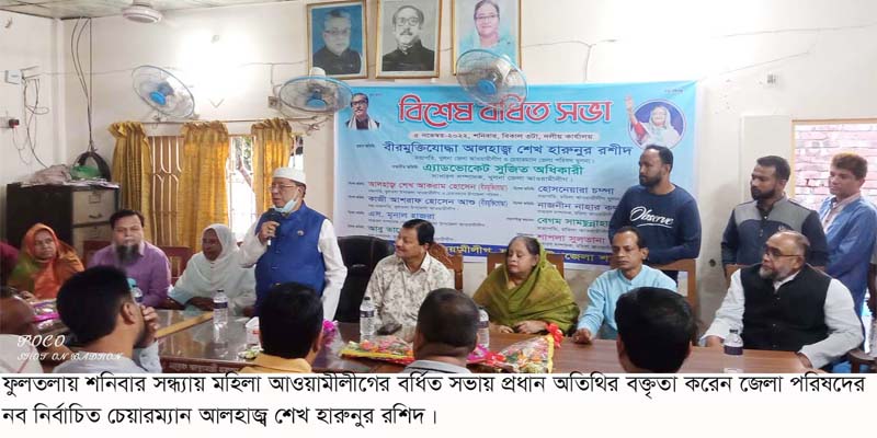 শনিবার সন্ধ্যায় দলীয় কার্যালয়ে ফুলতলা উপজেলা মহিলা আওয়ামীলীগের বর্ধিত সভায় প্রধান অতিথির বক্তৃতায় তিনি এ কথা বলেন। উপজেলা মহিলা আওয়ামীলীগের সভাপতি বেগম শামছুন্নাহারের সভাপতিত্বে অনুষ্ঠানে বিশেষ অতিথি ছিলেন জেলা আওয়ামীলীগের সাধারণ সম্পাদক এ্যাড. সুজিত অধিকারী, জেলা মহিলা আওয়ামীলীগের সভাপতি হোসনেয়ারা চম্পা, সাধারণ সম্পাদক নামমিন নাহার কনা, উপজেলা আওয়ামীলীগের সভাপতি ও উপজেলা পরিষদের চেয়ারম্যান আলহাজ¦ শেখ আকরাম হোসেন, জেলা আওয়ামীলীগের ধর্ম বিষয়ক সম্পাদক এ্যাড. তারিক হাসান মিন্টু। মহিলা আওয়ামীলীগের সাধারণ সম্পাদক শাপলা সুলতানা লিলির পরিচালনায় অন্যান্যের মধ্যে উপস্থিত ছিলেন উপজেলা আওয়ামীলীগের ভারপ্রাপ্ত সাধারণ সম্পাদক মৃনাল হাজরা, বীর মুক্তিযোদ্ধা কাজী আশরাফ হোসেন আশু, আবু তাহের রিপন, কামরুজ্জামান নান্নু, উপজেলা ভাইস চেয়াম্যান কে এম জিয়া হাসান তুহিন, জেলা যুবলীগ নেতা সরদার জাকির হোসেন, ইউপি চেয়ারম্যান শরীফ মোহাম্মদ ভুইয়া শিপলু, ইসমাইল হোসেন বাবলু, সাহিদুল মোল্যা, এস কে আলী ইয়াছিন, শহিদুল্লাহ প্রিন্স, রবীন বসু, এস কে মিজানুর রহমান, রবিউল ইসলাম মোল্যা, জেলা ছাত্রলীগ নেতা চিশতি নাজমুল বাশার, দপ্তর সম্পাদক বাধন হালদার, মোক্তার হোসেন, পলাশ রায়, সাহিদা ইসলাম নয়ন, রেক্সনা আজম, সোনিয়া আফরিন, রাফেজা বেগম, সেলিনা খাতুন প্রমুখ।