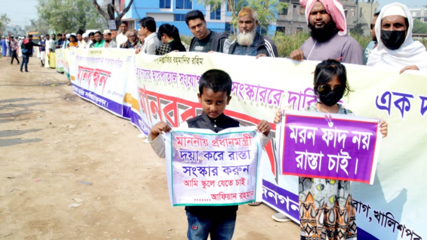 খুলনায় শহিদ শেখ আবু নাসের লিংক রোড সংস্কারের দাবিতে মানববন্ধন