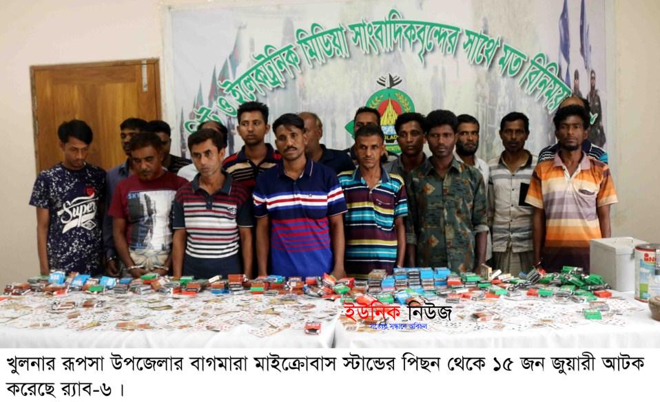 আটককৃত জুয়াড়ীরা হলেন, মোঃ আলী (৩২), মোঃ কামরুল ইসলাম (৩৮), মোঃ আব্দুস সালাম মিনা (৪৭), মোঃ মনির হোসেন (২৭), মোঃ নাসির শেখ (৪৫), মোঃ লাল মিয়া (৫০), মোঃ আতাউর রহমান আবু (৪৭), মোঃ সোলায়মান (৫০), মোঃ আরিফ হাওলাদার (২২), শেখ ফরিদ (৫৫), মোঃ ইউসুফ আলী (৪৫), মোঃ আলমগীর ফকির (৩৮), শেখ নূরুল ইসলাম (৩২), মহারাজ মুন্সি (৩৫) ও মোঃ ইসমাইল শেখ (৫৪)। তাদের বাসা খুলনাসহ পার্শ্ববর্তী বিভিন্ন জেলায়। গ্রেফতারকৃত জুয়ারী আসামীদের বিরুদ্ধে রূপসা থানায় দি পাবলিক গ্যামবিলিং এ্যাক্ট ১৮৬৭ এর ৩/৪ ধারায় ধারায় মামলা রুজু প্রক্রিয়াধীন রয়েছে।
