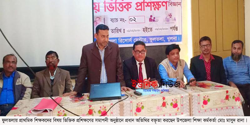 ফুলতলা অফিসঃ ফুলতলা উপজেলা রিসোর্স সেন্টার আয়োজিত প্রাথমিক বিদ্যালয়ের উপজেলা পর্যায়ে প্রধান শিক্ষক ও সহাকারী শিক্ষকদের ৬দিন ব্যাপী বিষয় ভিত্তিক বিজ্ঞান দ্বিতীয় ব্যাচের প্রশিক্ষণের সমাপনী অনুষ্ঠান বৃহস্পতিবার বিকালে অনুষ্ঠিত হয়। ইউআরসি ইন্সট্রাক্টর মোঃ রবিউল ইসলাম রনির সভাপতিত্বে অনুষ্ঠিত হয়। অনুষ্ঠানে প্রধান অতিথি ছিলেন ভারপ্রাপ্ত উপজেলা প্রাথমিক শিক্ষা অফিসার মাসুদ রানা। অন্যান্যের মধ্যে উপস্থিত ছিলেন সহকারী শিক্ষা অফিসার মোঃ আসাদুজ্জামান, প্রাথমিক শিক্ষক সমিতির সভাপতি মোঃ আনোয়ার হোসেন, সাধারণ সম্পাদক মোরাদুল ইসলাম, প্রশিক্ষক শিহাব উদ্দিন ওমর ও শিউলী রানী বড়াল প্রমুখ। প্রশিক্ষণ শেষে অতিথিবৃন্দ ৩০জন প্রশিক্ষানার্থীর মাঝে সার্টিফিকেট বিতরণ ও চ‚ড়ান্ত মূল্যায়নের ফলাফল ঘোষনা করেন এবং ৩জন প্রশিক্ষণার্থীকে পুরস্কার প্রদান করেন।