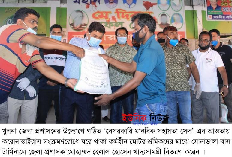 খুলনা অফিস : খুলনায় করোনাভাইরাস সংক্রমণরোধে ঘরে থাকা কর্মহীন মোটর শ্রমিকদের মাঝে খুলনা জেলা প্রশাসন খাদ্যসামগ্রী বিতরণ করে। খুলনা জেলা প্রশাসনের উদ্যোগে গঠিত ‘বেসরকারি মানবিক সহায়তা সেল’-এর আওতায় জেলা প্রশাসক মোহাম্মদ হেলাল হোসেন আজ সোমবারবিকেলে খুলনার সোনাডাঙ্গা বাস টার্মিনালে নিম্ন আয়ের ২৬০ জন শ্রমিকদের মাঝে চাল, ডাল, তেল, আলু, লবণ, সাবান ও মাস্কসহ নিত্যপ্রয়োজনীয় খাদ্যসামগ্রী বিতরণ করেন।