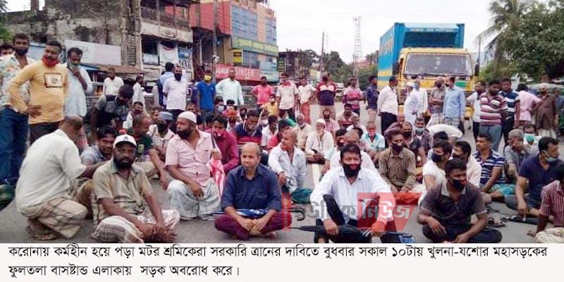 ফুলতলা (খুলনা) প্রতিনিধিঃ করোনায় কর্মহীন হয়ে পড়া মটর শ্রমিক ইউনিয়ন (১১১৪) ফুলতলা শাখার অসহায় শ্রমিকেরা সরকারি ত্রানের দাবিতে বুধবার সকাল ১০টা থেকে ঘন্টাব্যাপী খুলনা-যশোর মহাসড়কের ফুলতলা বাসষ্টান্ড এলাকা অবরোধ করে। এ সময় মটরশ্রমিক ফুলতলা শাখা সভাপতি ওয়াহিদ মুরাদ পিন্টু ও সাধারণ সম্পাদক সনজিৎ বসু প্রমুখ নেতৃবৃন্দ অভিযোগ করে বলেন, করোনায় প্রায় দেড় মাস কর্মহীন হয়ে পড়েছে ফুলতলা এলাকার বাস, ট্রাক, পিকআপ, মাইক্রো, থ্রি-হুইলার, ইজিবাইকের সহস্রাধিক শ্রমিক। ফলে সহস্রাধিক অসহায় মটর শ্রমিক পরিবার অর্ধহারে ও অনাহারে দিন কাটাচ্ছে। স্থানীয় প্রশাসন ও জনপ্রতিনিধিরা সরকারি ত্রান প্রদানের প্রতিশ্রুতি দিয়ে দফায় দফায় শ্রমিকদের পরিচয়পত্র, নাগরিকত্ব সনদ ও জাতীয় পরিচয়পত্রের ফটোকপি নিলেও আজ পর্যন্ত তাদের মাঝে কোন ত্রান বা খাদ্য সহায়তা পৌঁছায়নি। অবিলম্বে সরকারি ত্রান সহায়তা না পেলে পরিবার পরিজন নিয়ে আমরণ সড়ক অবরোধের ঘোষনা দেয়া হয়। কর্মসূচি চলাকালে এক পর্যায়ে ইউএনও পারভীন সুলতানা ও পুলিশ প্রশাসনের আশ্বাসে শ্রমিকরা অবরোধ প্রত্যাহার করে নেয়।