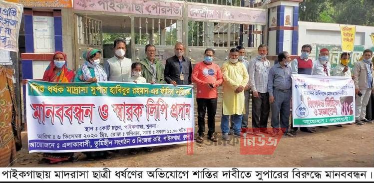 পাইকগাছা (খুলনা) সংবাদদাতা : খুলনার পাইকগাছায় চতুর্থ শ্রেনীর মাদ্রাসা ছাত্রীকে ধর্ষন করায় ধর্ষক সুপারের দৃষ্টান্ত মুলক শাস্তির দাবীতে মানববন্ধন ও ইউএনও বরাবর স্মারকলিপি দিয়েছে এলাকাবাসী। অন্যদিকে মাদ্রাসার ম্যানেজিং কমিটির সভায় সুপারকে সাময়িকভাবে বহিস্কার করা হয়েছে।
