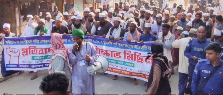 দাকোপ প্রতিনিধি : সুইডেন ও ডেনমার্কে পবিত্র কোরআন অবমাননা এবং শিক্ষা সিলেবাসে অসঙ্গতিপূর্ন তথ্য সংযুক্ত করার প্রতিবাদে দাকোপে ইমাম পরিষদের উদ্যোগে বিক্ষোভ মিছিল ও সমাবেশ অনুষ্ঠিত হয়েছে। রোববার বাদ জোহর উপজেলা হেড কোয়ার্টার জামে মসজিদ চত্বর থেকে হাজার-হাজার তৌহিদি জনতার গগন বিদারী শ্লোগানে মিছিলটি চালনা বাজার প্রদক্ষিন করে। এর আগে উপজেলা ইমাম পরিষদের সভাপতি অধাক্ষ্য মাওলানা অজিহুর রহমানের সভাপতিত্বে এবং হাফেজ আক্তারুল ইসলামের পরিচালনায় অনুষ্ঠিত প্রতিবাদ সমাবেশে বক্তৃতা করেন উপজেলা ইমাম পরিষদের সাধারণ সম্পাদক মাওলানা শায়খুল ইসলাম বীন হাসান, হাফেজ মাসুম বিল্লাহ, মুফতি শফিকুল ইসলাম, মাওলানা আব্দুস সাত্তার, মাওলানা আতিকুর রহমান, মাওলানা আব্দুর রাজ্জাক, মাওলানা আজিজুল হক, মুফতি ইকবাল হোসেন, হাফেজ রবিউল ইসলাম, মুফতি মুস্তাফিজুর রহমান, হাফেজ মাওলানা তবারক হোসাইন, মুফতি আহসান হাবীব, মাওলানা সোহরাব হোসাইন, মাওলানা আবুল হাসান, মাওলানা আব্দুল কুদ্দুস, মাওলানা আলামিন, মাওলানা আনোয়ার হোসেন, হাফেজ শওকত ইমাম, মাওলানা জাকারিয়া, মাওলানা ইয়াদুল ইসলাম প্রমুখ। সমাবেশে বক্তারা অবিলম্বে বিতর্কিত সিলেবাস বাতিল এবং কোরআন অবমাননার বিরুদ্ধে সরকারের কঠোর অবস্থান গ্রহনের দাবী জানান। সমাবেশে বিক্ষুদ্ধরা সুইডেনের জাতীয় পতাকায় অগ্নিসংযোগ করে।