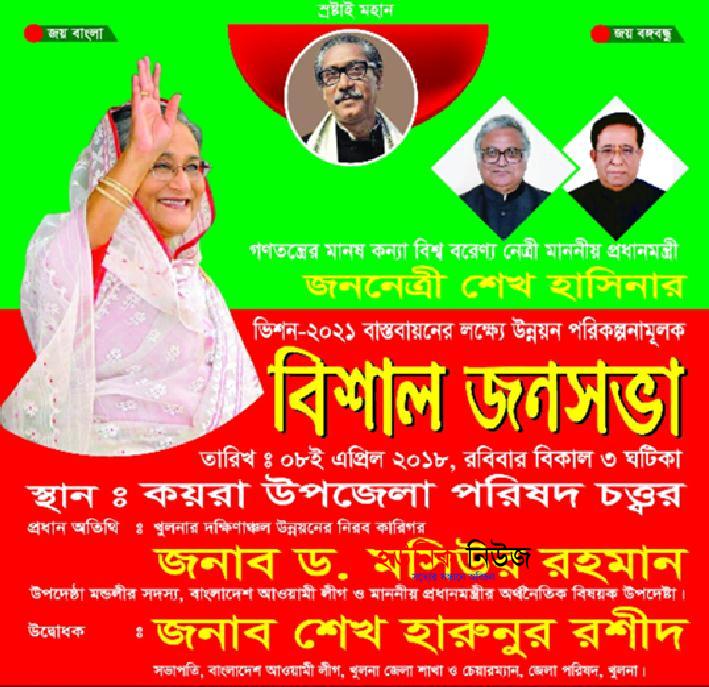 ইমতিয়াজ উদ্দিন, কয়রা : ৮ এপ্রিল বিকাল ৩টায় কয়রা-পাইকগাছা উপজেলাবাসীর ব্যানারে কয়রা উপজেলা পরিষদ মাঠে শেখ হাসিনার ভিষন-২০২১ বাস্তবায়নের লক্ষে উন্নয়ন পরিকল্পনা মূলক জনসভার আয়োজন করা হয়েছে। জনসভায় প্রধান অতিথি হিসেবে উপস্থিত থাকবেন বাংলাদেশ আওয়ামীলীগের উপদেষ্টা মন্ডলীর সদস্য ও প্রধানমন্ত্রীর অর্থ উপদেষ্টা ড. মশিউর রহমান। তবে জনসভায় সভাপতির চেয়ারে কে বসবেন এ নিয়ে চলছে নানা গুঞ্জন। জনসভার পোষ্টার ও লিফলেটে সভাপতি হিসেবে খুলনা জেলা আওয়ামী লীগের কোষাধ্যক্ষ ইঞ্জিনিয়র মাহবুবুল আলমের নাম প্রচারিত হলেও গতকাল শনিবার রাত্র থেকে জনসভার সভাপতি হিসেবে মাইকিং করা হয়েছে উপজেলা আওয়ামী লীগের সভাপতি জি এম মহসিন রেজার নাম। এর পরথেকে কয়রার রাজনীতির মাঠে চলছে এ নিয়ে জোর আলোচনা-সমালোচনা। সাধারন মানুষ থেকে শুরু করে রাজনৈতিক মহলে একটাই প্রশ্ন কে বসছেন জনসভায় সভাপতির চেয়ারে ? এমন প্রশ্নের জবাবে জেলা আ’লীগের কোষাধ্যক্ষ ও উপজেলা আ’লীগের সভাপতি দু’জনই সভাপতির চেয়ারে বসবেন বলে জোর দাবি করেছেন। কয়রা উপজেলা আওয়ামী লীগের সভাপতি জি এম মহসিন রেজা জানান, উপজেলা আওয়ামী লীগের সভাপতি হিসেবে তিনিই জনসভার সভাপতিত্ব করবেন। যারা বিভিন্ন পোষ্টারের মাধ্যমে সভাপতি হিসেবে নাম প্রচার করছেন তারা অগঠনতান্ত্রিক কাজ করছেন। তবে ভিন্ন কথা বলেছেন জনসভার পোষ্টারে সভাপতি হিসেবে নাম প্রচারিত হওয়া জেলা আ’লীগের কোষাধ্যক্ষ আলহাজ্ব ইঞ্জিনিয়র মাহবুবুল আলম। তিনি জানান, যারা গতকাল রাত্র থেকে মাইকিং এর মাধ্যমে সভাপতি হিসেবে নাম প্রচার করছিলেন সকাল থেকে তা বন্ধ হয়ে গেছে। উর্দ্ধতন নেতৃবৃন্দের সর্বসম্মতি ক্রমে তিনিই জনসভার সভাপতিত্ব করবেন। তবে উপজেলার জনসাধারণ বলছেন, সভাপতির চেয়ারে কে বসছেন তা জানতে অপেক্ষা করতে হবে সভা শুরু হওয়া পর্যন্ত।