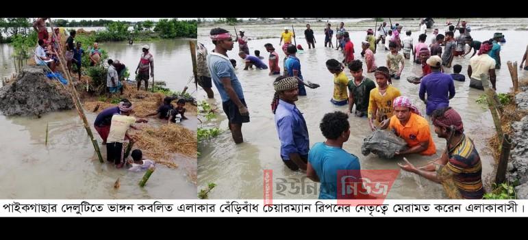 উপজেলার দ্বীপ বেষ্টিত ৪নং দেলুটি ইউনিয়ন গত ঘুর্ণিঝড় আম্পানে শিবসা নদীর গেওয়াবুনিয়া ও কালিনগরের ওয়াপদার বাঁধ ভেঙ্গে ব্যাপক এলাকা প্লাবিত হয়। যার ক্ষয়-ক্ষতির রেশ কাটিয়ে উঠতে না উঠতেই বুধবার দুপুরে জোয়ারের পানির চাপে চক্রিবক্রি বদ্ধ জলমহলের ক্ষতিগ্রস্থ বাঁধ ভেঙ্গে গেওয়াবুনিয়া, পারমধুখালী ও চক্রিবক্রির বিস্তীর্ণ এলাকা প্লাবিত হয়েছে। যাতে আমন ধানের বীজতলা, মৎস্য ঘের, ফসলের ক্ষেত প্লাবিত হয়ে ব্যাপক ক্ষয়-ক্ষতি হয়েছে। ক্ষতিগ্রস্থ হয়েছে ঘর-বাড়ি। পানি বন্ধি হয়ে পড়েছে শতশত পরিবার। স্থানীয় ইউপি চেয়ারম্যান রিপন কুমার মন্ডল জানান, খুলনার জনৈক আনাম চক্রিবক্রির ৩৭ একর জলমহলটিতে মাছ চাষ করে আসছে। অথচ খালের উত্তর ও দক্ষিণপাশে দুটি বাঁধ মেরামত না করায় বাঁধটি ঝুকিপূর্ণ হয়ে পড়ে। ফলে জোয়ারের পানির চাপে উত্তরপাশের বাঁধ ভেঙ্গে ৩টি গ্রাম প্লাবিত হয়। শুক্রবার সকালে স্থানীয় ইউপি চেয়ারম্যান রিপন কুমার মন্ডলের নেতৃত্বে স্বেচ্ছাশ্রমে বাঁধটি মেরামত করলেও বাঁধটি ঝুকির মধ্যে রয়েছে। উপজেলা নির্বাহী অফিসার এবিএম খালিদ হোসেন সিদ্দিকী বলেন, জলমহলটির ইজারা বাতিল করা হয়েছে। ভাঙ্গন কবলিত এলাকার রিপোর্ট প্রদানের জন্য কানুনগোকে পাঠানো হয়েছে। টেকসই বাঁধ মেরামতের ব্যবস্থা নেয়া হচ্ছে।