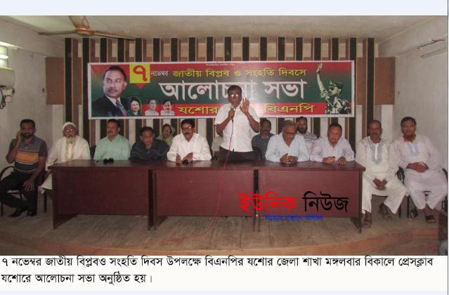 মঙ্গলবার বিকেলে যশোর প্রেসক্লাব মিলনায়তনে জাতীয় বিপ্লব ও সংহতি দিবস উপলক্ষে দলটি এ আলোচনা সভার আয়োজন করে। জেলা বিএনপির ভারপ্রাপ্ত সভাপতি শামসুল হুদার সভাপতিত্বে আলোচনা সভায় বক্তব্য রাখেন, দলটির জেলা শাখার সাধারণ সম্পাদক এড. সৈয়দ সাবেরুল হক সাবু, সহসভাপতি প্রফেসর গোলাম মোস্তফা, সাংগঠনিক সম্পাদক দেলোয়ার হোসেন খোকন, যুগ্ম সম্পাদক আব্দুস সালাম আজাদ, নগর বিএনপির সভাপতি সাবেক পৌরমেয়র মারুফুল ইসলাম, সদর উপজেলা বিএনপির সভাপতি মোহাম্মদ নুরুন্নবী, নগর বিএনপির সাধারণ সম্পাদক মুনির আহমেদ সিদ্দিকী বাচ্চৃু, সদর উপজেলা বিএনপির সাধারণ সম্পাদক কাজী আজম, জেলা যুবদলের ভারপ্রাপ্ত সাধারণ সম্পাদক এম তমাল আহমেদ, জেলা ছাত্রদলের সভাপতি রবিউল ইসলাম, নগর ছাত্রদলের সভাপতি ফারুক  হোসেন  প্রমুখ। এসময় অন্যান্য নেতৃবৃন্দের মধ্যে উপস্থিত ছিলেন, জেলা বিএনপির সহসভাপতি আব্দুস সবুর মন্ডল,  জেলা শ্রমিকদল সভাপতি এসএম মিজান, সাধারণ সম্পাদক সাহাবুদ্দিন আহমেদ, কৃষকদল নেতা উপাধ্যক্ষ মকবুল হোসেন, মহিলাদলের নেত্রী হাসিনা ইউসুফ, ফেরদৌসী বেগম,  রাশিদা রহমান, জোসনা আলীম, জোবায়দা হক, সুফিয়া বেগম, জেলা যুবদলের সভাপতি এহসানুল হক মুন্না,  বদিউজ্জামান ধনি, নূর ইসলাম বুল্লা, মনিরুজ্জামান মাসুম,  আনসারুল হক রানা, জেলা ছাত্রদলের সাধারণ সম্পাদক নাজমুল হোসেন বাবুল, সাংগঠনিক সম্পাদক মোস্তফা আমীর ফয়সাল প্রমুখ।