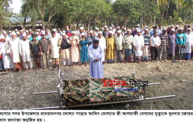 রবিউল ইসলাম মিটু, যশোর : যশোর সদর উপজেলার রামনগর মোল্যাপাড়ার মৃত আমিন মোল্যার স্ত্রী এবং বিদ্রোহী সাহিত্য পরিষদের কর্মকর্তা রবিউল হাসনাত সজল ও সোনিয়া সুলতানা চাঁপার দাদি আশরাফী বেগম (১০২) মঙ্গলবার গভীর রাতে বার্ধক্যজনিত কারণে মৃত্যু বরণ করেছেন। বুধবার দুপুরে বাদ জোহর জানাজা শেষে পারিবারিক গোরস্থানে তাকে দাফন করা হয়েছে। জানাজায় স্থানীয় রাজনৈতিক, সামাজিক, সাংস্কৃতিক, সাংবাদিকরা অংশগ্রহন করেন। মৃত্যুকালে ৫ ছেলে মেয়ে, আত্মীয় স্বজন ও গুণগ্রাহী রেখে গেছেন। জানাজা পরিচালনা করেন রামনগর মোল্যাপাড়া মাদ্রাসার মুফতি আব্দুল কাদের আল আমিনী।
