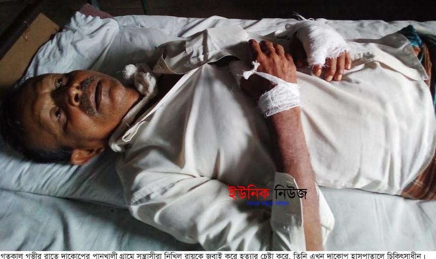 এলাকাবাসী ও এজাহার সুত্রে জানা যায় চলমান বিশ্বকাপ খেলা দেখে নিজ বাড়ীর বারান্দায় ঘুমিয়ে যায় পানখালী গ্রামের মৃতঃ নারায়ন রায়ের পুত্র নিখিল রায় (৫৫)। রাত আনুমানিক ২ টার দিকে শুয়ে কেবল তন্দ্রাভাব। এমন সময় তার গলায় দা দিয়ে পোঁচ দেওয়ার চেষ্টাকালে সে হাত দিয়ে বাঁধা দিয়ে চিৎকার করে ওঠে। সন্ত্রাসীরা দ্রুত পালিয়ে যায়। ততক্ষনে নিখিল রায়ের গলাসহ দু’হাত রক্তাত্ব জখম হয়। জানা যায় আহত নিখিল রায় এ ঘটনায় জড়িত হিসেবে একই গ্রামের জিন্নাত শেখের মাদকাসক্ত পুত্র সিপার শেখকে দেখেছে মর্মে সন্দেহের কথা স্বজনদের কাছে জানায়। ঘটনার সময় বিশ্বকাপের খেলা চলমান থাকায় অনেকেই পাশে খেলা দেখছিল। চিৎকারের শব্দে তারা এগিয়ে এসে ঘটনা শুনে সিপারের খোজে বের হয়। ব্যাপক খোজাখুজির এক পর্যায়ে পালিয়ে যাওয়ার চেষ্টাকালে এলাকাবাসী ফজরের আযানের সময় পানখালী ফেরীঘাট থেকে তাকে আটক করে থানা পুলিশের হাতে তুলে দেয়। ঘটনার রাতে সিপারকে দা ও খেলনা পিস্তলসহ কোন একজন দেখেছিলো বলে জানা গেছে। জানা যায় কোন পূর্ব শত্রুতা ছাড়াই সিপার এ কাজ করছিলো। মাদকাসক্ত বেসামাল সিপার অতীতে এমন একাধীক ঘটনা ঘটিয়েছে বলে জানা গেছে। এ দিকে রক্তাত্ব জখম অবস্থায় নিখিল রায়কে ভোরে দাকোপ হাসপাতালে ভর্তি করা হয়। তার দু’হাতে ১৩ টি সেলাই লেগেছে বলে জানা যায়। এ রিপোর্ট লেখা পর্যন্ত নিখিল রায় বাদী হয়ে সিপারকে প্রধান আসামী করে হাটবাটি বটিয়াঘাটার সোলায়মান ঢালীসহ অজ্ঞাত আরো ৩/৪ জনকে আসামী করে দাকোপ থানায় এজাহার দাখিল করা হয়েছে। এ ব্যাপারে থানার অফিসার ইনচার্জ শাহাবুদ্দিন চৌধুরী বলেন, ঘটনার মুলহোতাকে আটক করা হয়েছে বাকীদের গ্রেফতারে পুলিশ তৎপর।