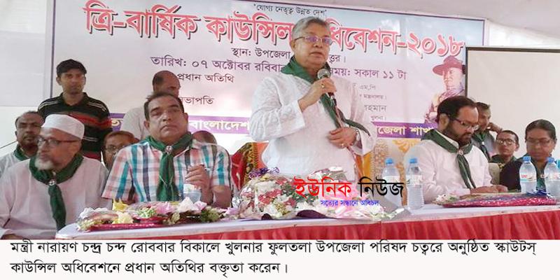 রোববার বিকালে খুলনার ফুলতলা উপজেলা পরিষদ চত্বরে অনুষ্ঠিত ত্রি-বার্ষিক স্কাউটস্ কাউন্সিল অধিবেশনে প্রধান অতিথির বক্তৃতায় তিনি এ কথা বলেন। উপজেলা স্কাউটস সভাপতি ও ইউএনও আহমেদ জিয়ারুর রহমানের সভাপতিত্বে বিশেষ অতিথি ছিলেন স্কাউটস উপ-পরিচালক লতিফ উদ্দিন আহমেদ, মুক্তিযোদ্ধা কামন্ডার কাজী জাফর উদ্দিন, জেলা আওয়ামীলীগের সহসভাপতি বিএমএ সালাম, কৃষি বিষয়ক সম্পাদক মোঃ আসলাম খান, মাধ্যমিক শিক্ষা কর্মকর্তা শেখ মতিউর রহমান, প্রাথমিক শিক্ষা কর্মকর্তা চায়না রানী দত্ত, শিক্ষাবিদ আলহাজ্ব আনোয়ারুজ্জামান মোল্যা, শিক্ষক সমিতির সভাপতি অধ্যক্ষ গাজী মারুফুল কবির। অন্যান্যের মধ্যে উপস্থিত ছিলেন অধ্যক্ষ প্রফুল্ল কুমার চক্রবর্তী, শিক্ষক মোশারফ হোসেন মোড়ল, স্কাউটস সম্পাদক বিজয় কৃষ্ণ হালদার, মোঃ আনোয়ার হোসেন, মোঃ আক্তার হোসেন, শিহাব উদ্দিন প্রমুখ। এদিকে বঙ্গবন্ধু গোল্ডকাপ টুর্ণামেন্ট অনুর্ধ্ব ১৭ ফুলতলা দল খুলনা বিভাগে চ্যাম্পিয়ান হওয়ায় উপজেলা পরিষদের পক্ষ থেকে খেলোয়াড়দের সংবর্ধনা অনুষ্ঠানে মন্ত্রী নারায়ণ চন্দ্র চন্দ প্রধান অতিথি হিসাবে উপস্থিত ছিলেন।