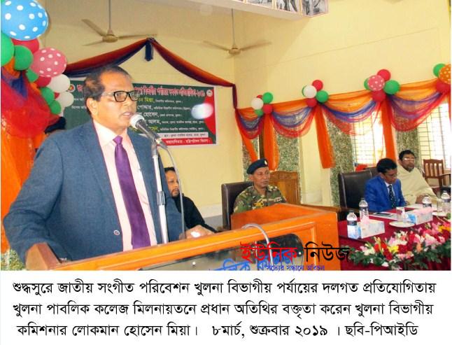 খুলনা : শুদ্ধসুরে জাতীয় সংগীত পরিবেশন খুলনা বিভাগীয় প্রতিযোগিতা-২০১৯ শুক্রবার সকালে খুলনা পাবলিক কলেজ মিলনায়তনে অনুষ্ঠিত হয়। সকালে প্রধান অতিথি হিসেবে প্রতিযোগিতার উদ্বোধন করেন খুলনা বিভাগীয় কমিশনার লোকমান হোসেন মিয়া।