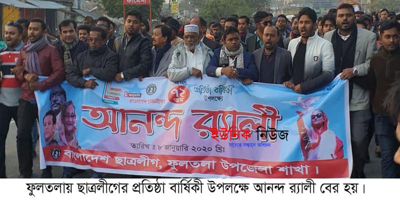 ফুলতলা অফিসঃ বাংলাদেশ ছাত্রলীগের ৭২তম প্রতিষ্ঠা বার্ষিকী পালন উপলক্ষে ফুলতলা উপজেলা শাখার উদ্যোগে বুধবার বিকালে ফুলতলা স্বাধীনতা চত্বরে র্যালী, আলোচনা সভা ও সাংস্কৃতিক অনুষ্ঠান এবং ফ্রি মেডিকেল ক্যাম্প অনুষ্ঠিত হয়। উপজেলা ছাত্রলীগের সভাপতি মঈনুল ইসলাম নয়নের সভাপতিত্বে প্রধান অতিথি ছিলেন উপজেলা আওয়ামীলীগ সভাপতি ও উপজেলা পরিষদের চেয়ারম্যান আলহাজ্ব শেখ আকরাম হোসেন। অনুষ্ঠানের উদ্ভোধন করেন খুলনা জেলা ছাত্রলীগের সভাপতি পারভেজ হাওলাদার। প্রধান বক্তা ছিলেন জেলা ছাত্রলীগের সাধারণ সম্পাদক মোঃ ইমরান হোসেন। বিশেষ অতিথি ছিলেন উপজেলা আওয়ামীলীগের সাধারণ সম্পাদক সরদার শাহাবুদ্দিন জিপ্পী, মুক্তিযোদ্ধা কাজী জাফর উদ্দিন, জেলা যুবলীগের যুগ্ন সাধারণ সম্পাদক সরদার জাকির হোসেন, কামরুজ্জামান নান্নু, ইউপি চেয়ারম্যান শরীফ মোহাম্মদ ভুইয়া শিপলু। সাধারণ সম্পাদক এস কে সাদ্দাম হোসেনের পরিচালনায় অন্যান্যের মধ্যে বক্তৃতা করেন মিরাজুল ইসলাম, আমির মোমেনিন রানা, তানভীর রহমান আকাশ, মৃনাল কান্তি বাছাড়, আশিকুজ্জামান তানভীর, কাজী নাজিব, বাধন হালদার, সাবেক ছাত্রলীগ নেতা আশরাফুল আলম কচি, এনামুল কবির, তুহিন কুন্ডু, নূর আলামিন, তাসমীর হাসান, শিহাব হোসেন, সাজ্জাদুল ইসলাম বাবু, সাকীব হোসেন, আরিফুল ইসলাম, শান্ত হোসেন, আসীক আলামিন প্রমুখ। পরে এক সাংস্কৃতিক অনুষ্ঠান অনুষ্ঠিত হয়।