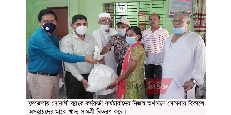 ফুলতলা (খুলনা) প্রতিনিধিঃ সোনালী ব্যাংক ফুলতলা শাখার উদ্যোগে সোমবার বিকালে এলাকায় করোনায় লক ডাউনে কর্মহীন ৭০ অসহায় পরিবারের মাঝে খাদ্য সামগ্রী বিতরণ করা হয়। ব্যাংকের স্থানীয় শাখার কর্মকর্তা ও কর্মচারীদের নিজস্ব অর্থায়নে খাদ্য সামগ্রী বিতরণকালে অন্যান্যের মধ্যে উপস্থিত ছিলেন শাখা ব্যবস্থাপক মোঃ রুহুল্লা আল মামুন, মুক্তিযোদ্ধা কমান্ডার কাজী জাফর উদ্দিন, বিআরডিবি কর্মকর্তা মোঃ আফরুজ্জামান, আঃ গনি মোড়ল, প্রেসক্লাব ফুলতলা সভাপতি তাপস কুমার বিশ্বাস, উপজেলা প্রেসক্লাব সভাপতি শামসুল আলম খোকন, সহকারী অধ্যাপক মোঃ নেছার উদ্দিন, মুক্তিযোদ্ধা সুবোধ বসু, ব্যাংক কর্মকর্তা সাহিদা খানম, জাকারিয়া হুসাইন, তপন কুমার সিংহ, আরিফ হোসেন, কিশোর কুমার, জ্যোতিপ্রকাশ মন্ডল প্রমুখ।