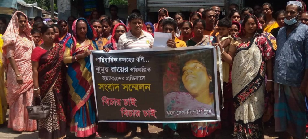 বটিয়াঘাটা প্রতিনিধি: বটিয়াঘাটায় গৃহবধূ ঝুমুর হত্যার আসামিদের গ্রেফতার ও শাস্তির দাবিতে বৃহষ্পতিবার বেলা ১২ টায় এক মানববন্ধন কর্মসূচি পালিত হয়। মানববন্ধন কর্মসূচিতে অন্যান্যের মধ্যে উপস্থিত ছিলেন উপজেলা আ’লীগের সাংগঠনিক সম্পাদক অনুপ গোলদার, ইউপি সদস্য দেবব্রত মল্লিক দেবু, ঠাকুর ঠাকুর দাস মন্ডল, সুকেস রায়, বিউটি রায়, নমিতা রায়, রমেশ রাজ সহ শত শত নারী-পুরুষ । উল্লেখ্য গত ৩১ আগস্ট দুপুরে আসামি দেবকুমার রায়(৪৫), বিধান রায় (৫৫), প্রান্ত রায়(২৫), পারুল রায়(৪৭), বিউটি রায়(৪২), দিপিকা রায়(৩০), ও শংকর রায় মিলে ভিকটিমের স্বামী দেবকুমার রায়ের নির্যাতনে গৃহবধূ ঝুমুর রায়(২৫)কে গলায় ফাঁস দিয়ে হত্যা করে । এব্যাপারে ভিকটিমের পিতা রিপন রায় বাদী হয়ে বটিয়াঘাটা জুডিশিয়াল ম্যাজিস্ট্রেট আমলি আদালত খুলনায় সি,আর ২৫৩/২২ নং হত্যা মামলা দায়ের করেন । বিচারক মামলাটি আমলে নিয়ে পবিআই পুলিশের উপর তদন্তের নির্দেশ দেন । বৃহস্পতিবার মানববন্ধন শেষে এক সংবাদ সম্মেলনে আয়োজনের মাধ্যমে আসামিদের গ্রেফতার পূর্বক শাস্তির দাবিতে লিখিত বক্তব্য পাঠ করেন ।