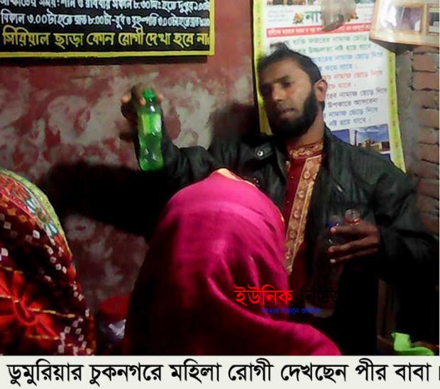 মোঃ আঃ লতিফ মোড়ল, ডুমুরিয়া (খুলনা) : খুলনার ডুমুরিয়া উপজেলার চুকনগরে এক নতুন পীর বাবার আবির্ভাব ঘটেছে। তার পানি পড়াতে নাকি ভাল হয় সব রোগ। সর্দি জ্বর থেকে শুরু করে বাতব্যথা, চর্মরোগ, এলার্জী, সাপে কাটা, কুকুরে কামড়ানো, বিড়ালে কামড়ানো, জ্বীনের আছর, বারণ দেয়া যে কোন বিষয়ের বিশেষজ্ঞ তিনি। আস্তানা গেড়েছেন চুকনগর শহরের হাইস্কুল রোডের একটি ঘরের মধ্যে। প্রতিদিন শত শত রোগী আসছে পীর বাবার কাছে। সকাল ৯ টা থেকে দুপুর ১ টা এবং বিকাল ৪ টা থেকে রাত ৯ টা পর্যন্ত রোগী দেখেন। গত শনিবার বিকাল ৫ টার দিকে তার আস্তানায় গিয়ে দেখা যায় প্রায় ৫০ জনের মত রোগী। যার মধ্যে ৪০ জনের মত মহিলা। সকলের হাতে পানি ও তেলের বোতল। একেক জনকে একেক ভাবে চিকিৎসা করাচ্ছেন তিনি। পীর বাবার নাম আব্দুল লতিফ। তিনি ডুমুরিয়া উপজেলার রোস্তমপুর গ্রামের মোক্তার মোড়লের পুত্র। বয়স ৩৫ বছরের মত। তার আস্তানায় মোট ৪ টি সাইন বোর্ড রয়েছে। একটিতে লেখা রয়েছে তার শিক্ষাগত যোগ্যতা, একটিতে রোগের চিকিৎসা ফি-সাপে কাটা ফি ৫০০ টাকা, কুকুরে কামড়ানো ফি ২৫০ টাকা, বিড়ালে কামড়ানো ফি ১৫০ টাকা, অশ্ব রোগী ২০০ টাকা, জ্বিনে ধরা ফি ৩০০ টাকা, প্রয়োজনে বারণ ফি ১০০ টাকা, বাড়ি বন্ধ করা ফি ৩০০ টাকা। একটি সাইন বোর্ডে লেখা আছে প্রথম সাক্ষাত ৫০ টাকা, দ্বিতীয় সাক্ষাত ৩০ টাকা। আরেকটি সাইন বোর্ডে লেখা আছে আল্লাহর রহমত চাই, আপনাদের সহযোগিতা চাই, ২০১৯ সালে হজ্ব করতে চাই। এসময় পীর বাবার কাছে চিকিৎসার কোন সনদ আছে জানতে চাইলে তিনি বলেন কোন সনদ নেই আল্লাহর কালাম পড়ে ফু দিলে সব রোগ ভাল হয়ে যায়। আস্তানায় উপস্থিত কয়েকজন রোগীর সাথে কথা হয় সাংবাদিকদের। এদের মধ্যে রাবেয়া বেগম (৬০) এসেছেন এলার্জী রোগ নিয়ে, রওশানারা (৪০) এসেছেন পেটে ব্যথা রোগের চিকিৎসা নিতে। মাজায় ব্যথা সারাতে এসেছেন হাফিজা বেগম (৪০)। এমনিভাবে বহু রোগী তাদের রোগ নিরাময়ের জন্য হুজুরের দরবারে এসেছেন। কিন্তু তাদের সবাই প্রথম বারের মত এসেছেন। আশপাশের অনেকেই হুজুরের পানি পড়াতে সুস্থ হয়ে গেছেন এই গুজব শুনে এসেছেন তারা। সাংবাদিকদের উপস্থিতি টের পেয়ে হুজুর তার সব সাইনবোর্ড অপসারণ করে ফেলেন। এ ব্যাপারে জানতে চাইলে রোস্তমপুর ওয়ার্ডের ইউপি সদস্য শেখ শহিদুল ইসলাম বলেন যদিও ঝাড় ফুক, পানি পড়ার কোন ভিত্তি নেই, তবে তার হাতে অনেক রোগী ভাল হয় শুনেছি। আটলিয়া ইউপি চেয়ারম্যান এ্যাডঃ প্রতাপ রায় বলেন, এ সবই ভাওতাবাজী ও প্রতারণা। এ ধরনের কাজের সাথে জড়িতদের আ্ইনের আওতায় আনার দাবি জানান তিনি।