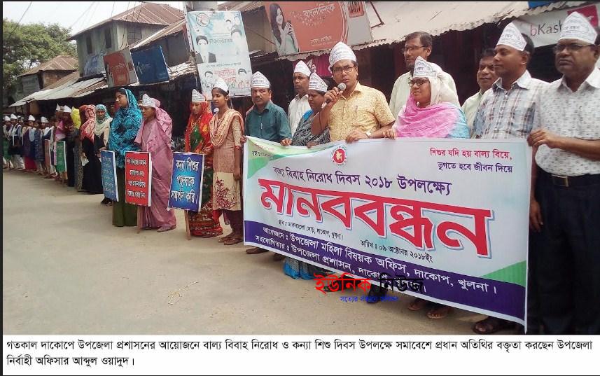 দাকোপ প্রতিনিধি : দাকোপে জাতীয় বাল্য বিবাহ নিরোধ ও জাতীয় কন্যা শিশু দিবস পালনে মানববন্ধন ও সমাবেশ অনুষ্ঠিত হয়েছে। মঙ্গলবার বেলা ১১ টায় উপজেলা সদর চালনা ডাকবাংলার মোড়ে অনুষ্ঠিত মানববন্ধন ও সমাবেশে প্রধান অতিথির বক্তৃতা করেন উপজেলা নির্বাহী অফিসার আব্দুল ওয়াদুদ।