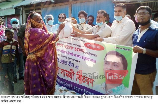 বিএনপির ভাইস চেয়ারম্যান তারেক রহমানের নিদের্শে দাকোপ উপজেলার ৯ টি ইউনিয়নের অসহায় পরিবারের মাঝে খাদ্য সামগ্রী বিতরন কার্যক্রমের উদ্বোধন করেন খুলনা জেলা বিএনপির সাধারণ সম্পাদক আলহাজ্ব আমির এজাজ খান। শনিবার দুপুরে চালনা পৌরসভার লঞ্চঘাট এলাকায় খাদ্য সামগ্রী বিতরণ কার্যক্রমের উদ্বোধন করা হয়। এ সময় অন্যান্যের মধ্যে উপস্থিত ছিলেন জেলা নেতা ও দাকোপ উপজেলা বিএনপির আহবায়ক আবুল খায়ের খান, খুলনা জেলা বিএনপির সহ-সভাপতি মনিরুজ্জামান মন্টু, খায়রুল ইসলাম, জেলা বিএনপির যুগ্ম-সাধারণ সম্পাদক আরশাফুল আলম নান্নু, খুলনা মহানগরনেতা রফিকুল ইসলাম, উপজেলা বিএনপির যুগ্ম-আহবায়ক পৌর কাউন্সিলর অসিত কুমার সাহা, চালনা পৌর বিএনপি নেতা শেখ মোজাফ্ফার হোসেন, বাহাদুর মুন্সি, ইসমাইল হোসেন, চালনা পৌর কাউন্সিলর আইয়ুব আলী কাজী, তরিকুল ইসলাম নান্নু, কামরুল ইসলাম টুকু, রমজান গাজী, রবিউল ইসলাম মনা, তরিকুল ইসলাম গাজী, জি এম রুমন, বাদল শেখ প্রমুখ। এ সময় ৫শত পরিবার মাঝে পরিবার প্রতি ৫ কেজি চাউল ও ২ কেজি আলু বিতরন করা হয়।