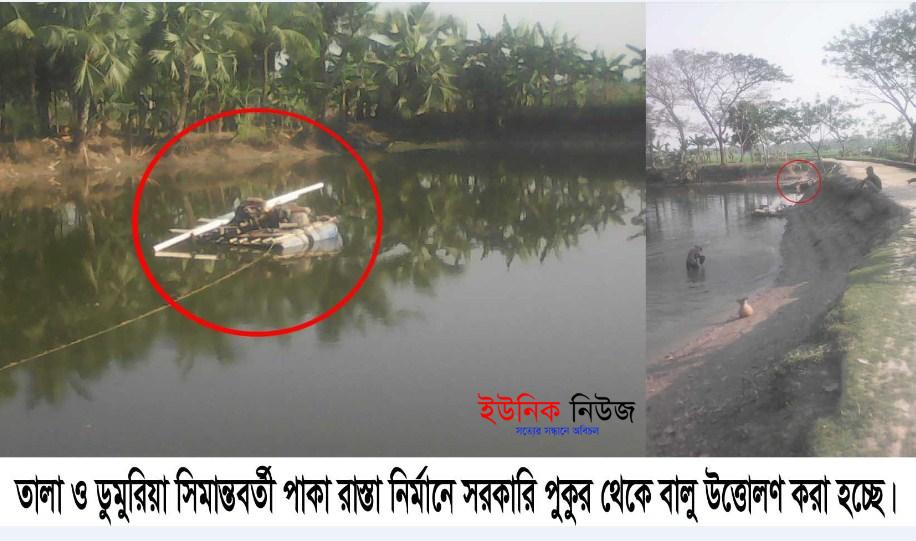 ডুমুরিয়া (খুলনা) প্রতিনিধি : ডুমুরিয়া উপজেলার মাগুরাঘোনা এলাকায় পাঁকা রাস্তা নির্মাণে সরকারি পুকুর হতে অবৈধ ভাবে বালি উত্তোলন করে বিক্রির অভিযোগ উঠেছে। স্থানীয় কতিপয় ভূমি দস্যু বালু উত্তোনের লক্ষ্যে দুটি শক্তিশালী বুলড্রেজার ম্যাশিন বসিয়ে প্রতিদিন হাজার হাজার ফুট বালু উত্তোলন করে রাস্তা নির্মানের ঠিকাদারের কাছে বিক্রি করছে। এলাকাবাসী ও সংশ্লিষ্ট সূত্রে জানা গেছে ডুমুরিয়ার উপজেলার মাগুরাঘোনা ইউনিয়নের আরশনগর গ্রামের সরকার পুকুর নামক স্থান হতে তালা উপজেলার জেয়ালা অভিমুখী রাস্তা পাঁকা করনের জন্য কার্যক্রম চলছে। এ রাস্তা নির্মানের জন্য ঠিকাদারের সাথে ৫লাখ টাকার বিনিময় ৫০ হাজার ফুট বালু উত্তোলন কর সরবরাহের লক্ষ্যে চুক্তি করেছেন এলাকার জনৈক রাশেদ মোড়ল। বালু উত্তোলনকারী শ্রমিকদের কাছে সরকারী পুকুরের বালু কেনো উত্তোলন করা হচ্ছে জানতে চাইলে তারা রাশেদ মোড়লকে দেখিয়ে দেন। রাশেদ মোড়ল সাংবাদিকদের উপস্থিতি টের পেয়ে কোন কথা বলতে রাজি না হয়ে স্থান ত্যাগ করেন। পরবর্তীতে তার সেল ফোনে যোগাযোগ করা হলে নিতি নিজেকে কয়েকটি মিডিয়ার সাংবাদিক হিসাবে পরিচয় দেন। অনুসন্ধানে আরো জানা গেছে, সরকার পুকুর দীর্ঘদিন যাবৎ সরকারি ভাবে খাষ খতিয়ানের সম্পত্তি হিসাবে ইজারা প্রদান করা হয়। কিন্তু ঐ সম্পত্তি ব্যক্তি মালিকানা সম্পত্তি দাবি করে আরোশনগর গ্রামের মিজানুর রহমান মাষ্টার ও কামরুল মাষ্টার আদালতে মামলা দায়ের করে। বর্তমান পুকুরটি নিয়ে সরকারের সাথে মিজানুর গংদের মামলা চলমান রয়েছে। মামলা নিষ্পত্তি না হলেও ক্ষমতার জোর দেখিয়ে মিজানুর গংরা বালু উত্তোলনের জন্য পুকুরটি বর্তমান রাশেদ মোড়লের মাধ্যমে বুলড্রেজার মেশিন বসিয়ে বালু উত্তোলন করছে। এ বিষয়ে মিজানুর রহমান জানতে চাইলে তিনি বলেন পুকুরটি তাদের রেকর্ডীয় সম্পত্তি বলে দাবী করেন এবং তাদের জমিতে যা খুশি তাই করতে পারেন বলে মন্তব্য করেন। নাম প্রকাশ্যে অনিচ্ছুক এলাকার একাধিক ব্যক্তি জানান বর্তমান যে রাস্তারি নির্মানের জন্য বালু উত্তোলন করা হচ্ছো ওই রাস্তাটি সরকার পুকুরটি পার্শ্বে হওয়ার ফলে বালু উত্তোলন করে রাস্তা নির্মান করা হলে মূল অংশসহ একাধিক ফসলীজমি ধ্বসে যেতে পারে। এ বিষয়ে ডুমুরিয়া উপজেলা প্রকৌশলী বিদ্যুৎ কুমার দাস জানান রাস্তা নির্মানের জন্য ঠিকাদারকে টেন্ডারের মাধ্যমে স্থানীয় ভাবে বালু ম্যানেজ করার কথা বলা হয়েছে। কেন সরকারি পুকুর থেকে সংশ্লিষ্ট প্রশাসনের অনুমতি ছাড়া বালু উত্তোলন করে তা ব্যবহার করা হবে জানতে চাইলে তিনি বলেন, আপনারা চাইলে রাস্তা নির্মান হবে, না চাইলে হবে না। এ প্রসঙ্গে ডুমুরিয়া উপজেলা সহকারি কমিশনার (ভূমি) মোহাম্মদ নাজমুল আহসান খান এর কাছে 