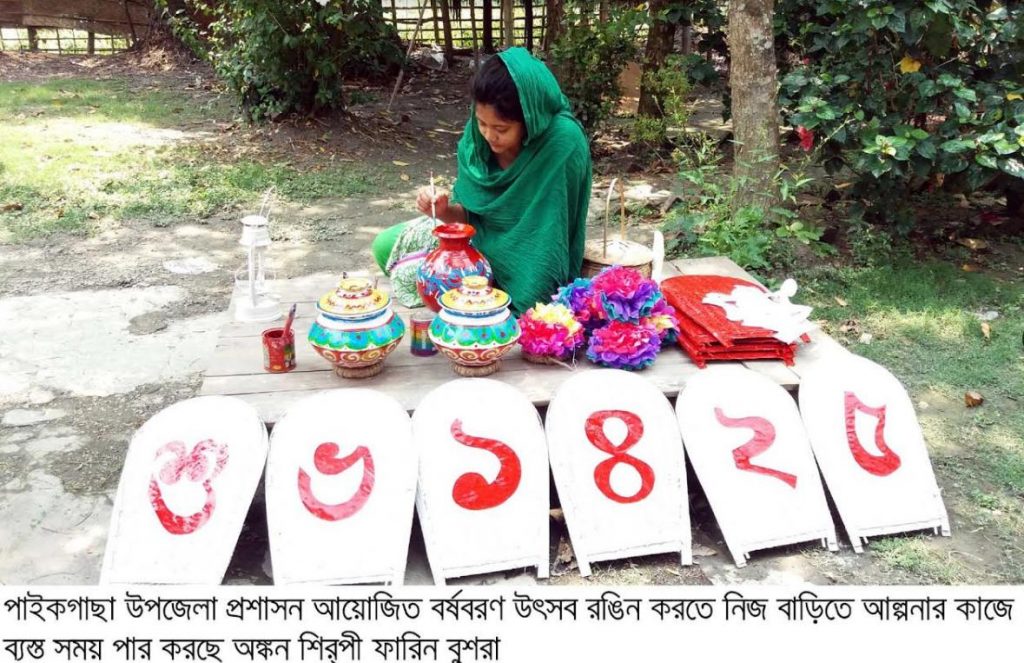পাইকগাছা (খুলনা) প্রতিনিধি : দীর্ঘ একটি বছর পেরিয়ে আমাদের মাঝে আবার আসছে প্রাণের উৎসব, রঙের উৎসব পহেলা বৈশাখ। আগামী শনিবার পুরনো সব পিছনে ফেলে নতুন কেতন উড়িয়ে শুরু হবে আরেকটি বছর। গত বারের মতই নতুন বছরকে বরণ করে নিতে পাইকগাছা উপজেলা প্রশাসনের পক্ষ থেকে নানা আয়োজন করা হয়েছে। আয়োজিত কর্মসূচির মধ্যে রয়েছে, বর্ণাঢ্য মঙ্গল শোভাযাত্রা, পান্তা ভোজ, গ্রামীন খেলাধূলা, ঘুড়ি ওড়ানো প্রতিযোগিতা, সাংস্কৃতিক অনুষ্ঠান ও বৈশাখী মেলা। বর্ষবরণ উৎসবকে রঙিন করতে উপজেলা প্রশাসনের আয়োজিত কর্মসূচিতে এবার যোগ হয়েছে আল্পনা অঙ্কন। যা এর আগে কখনো ছিল না। আল্পনার মাধ্যমে পহেলা বৈশাখের এবারের বর্ষবরণ উৎসব বিগত যে কোন বছরের চেয়ে রঙিন করে তুলবে বলে ধারণা করছেন আয়োজক কর্তৃপক্ষ। আল্পনার এ দায়িত্ব অর্পন করা হয়েছে নর্থওয়ের্ষ্টান ইউনিভার্সিটির আইন বিভাগের ছাত্রী ফারিন বুশরাকে। দায়িত্ব অর্পনের পর হতে আল্পনার কাজে ব্যস্ত সময় পার করছে অঙ্কন শিল্পী ফারিন। পহেলা বৈশাখের প্রতিটি জিনিসপত্র নিপুন কারুকাজ করার মাধ্যমে বাঙালীর ঐতিহ্য ফুটিয়ে তুলতে প্রতিদিন সকাল থেকে গভীর রাত পর্যন্ত আল্পনার কাজ করছে ফারিন। ফারিন বুশরা পাইকগাছা পৌরসভার ৭নং ওয়ার্ড বাতিখালী গ্রামের খায়রুল আলম এর মেয়ে, মা আফরা নাজলীন। দুই ভাই বোনের মধ্যে ফারিন বড়। সে ২০১৪ সালে পাইকগাছা সরকারি উচ্চ বিদ্যালয় থেকে এসএসসি ও ২০১৬ সালে পাইকগাছা কলেজ থেকে এইচএসসি পাস করে বর্তমানে খুলনা নর্থওয়ের্ষ্টান ইউনিভার্সিটির আইন বিভাগে অধ্যায়নরত রয়েছে। ফারিন কোন প্রশিক্ষণ ছাড়ায় শিশু বয়স থেকেই অঙ্কনের কাজ করে আসছে। এখনো সে শখ হিসাবে অঙ্কনের কাজ অব্যাহত রেখেছে। তবে ভবিষ্যতে নিজের তৈরি জিনিস দিয়ে একটি বুটিক্স হাউস করার তার পরিকল্পনা রয়েছে। বর্তমানে হাতের সেলাই, ব্লক বটিক্স, কাপড়ে রং, জামার ডিজাইন ও ব্যাগের কাজ সহ তার তৈরি ও কাজ করার জিনিসপত্র ইতোমধ্যে দুহিতা ফেসবুক পেইজের মাধ্যমে বিক্রি করা শুরু করেছে। ভবিষ্যতে এর মাধ্যমে প্রশিক্ষণ দিয়ে দক্ষ করে তোলার মাধ্যমে এলাকার শিক্ষিত বেকার নারীদের আত্ম কর্মসংস্থান সৃষ্টি ও সাবলম্বী করে তুলতে চাই বলে জানিয়েছেন অঙ্কন শিল্পী ফারিন।