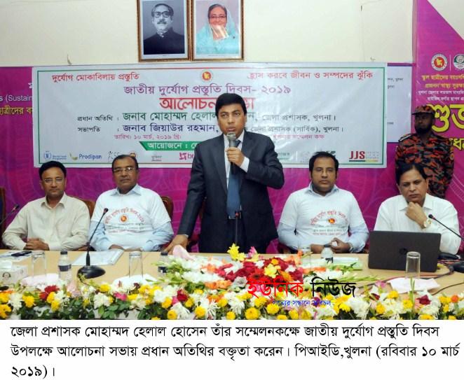 আলোচনা সভায় প্রধান অতিথির বক্তৃতায় খুলনা জেলা প্রশাসক মোহাম্মদ হেলাল হোসেন বলেন, দক্ষিণ এশিয়ার মধ্যে বাংলাদেশ অত্যন্ত দুর্যোগ ঝুঁকি প্রবণ এলাকা। জলবায়ু পরিবর্তন এই ঝুঁকিকে আরো বাড়িয়ে দিয়েছে। কিন্তু প্রাকৃতিক দুর্যোগের উপর মানুষের কোন হাত না থাকলেও প্রস্তুতি খাকলে দুর্যোগের ক্ষয়ক্ষতি অনেকটা প্রশমন করা সম্ভব। প্রধান অতিথি আরো বলেন, প্রাকৃতিক দুর্যোগের পাশাপাশি মনুষ্যসৃষ্ট কিছু দুর্যোগ আমাদের চিন্তার বিষয় হয়ে দাঁড়িয়েছে। বড় বড় ভবন নির্মাণের ক্ষেত্রে বিল্ডিং কোড যথাযথভাবে মানা হচ্ছেনা। নিরাপত্তার কথা চিন্তা না করে ভবন নির্মাণ কোম্পানীগুলো ব্যবসায়িক লাভের কথা চিন্তা করে নিম্নমানের দ্রব্য দিয়ে ভবন নির্মাণ করছে। তিনি প্রত্যেককে তার নিজ নিজ অবস্থান থেকে দেশের প্রচলিত নিয়ম কানুন মেনে চলার মাধ্যমে দুর্যোগের ক্ষয়ক্ষতি হ্রাসে এগিয়ে আসার আহবান জানান।