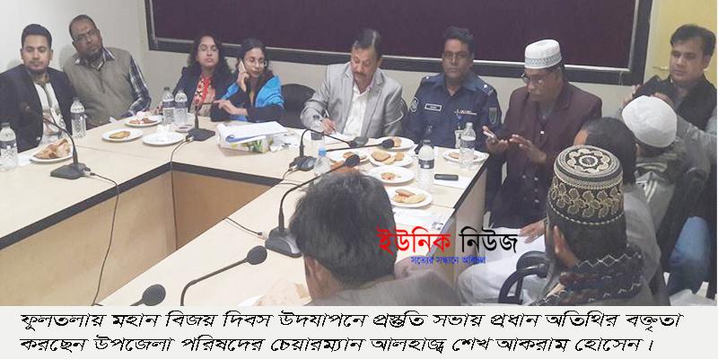 ফুলতলা (খুলনা) প্রতিনিধিঃ ফুলতলা উপজেলা প্রশাসনের উদ্যোগে মহান বিজয় দিবস-২০১৭ উদযাপনের লক্ষে এক প্রস্তুতি সভা রোববার বিকালে উপজেলা পরিষদ সভা কক্ষে ইউএনও মাশরুবা ফেরদৌসের সভাপতিত্বে অনুষ্ঠিত হয়। সভায় প্রধান অতিথি ছিলেন উপজেলা পরিষদের চেয়ারম্যান আলহাজ¦ শেখ আকরাম হোসেন। বিশেষ অতিথি ছিলেন সহকারী কমিশনার (ভূমি) পিংকি সাহা, ওসি মোঃ আসাদুজ্জামান মুন্সী, ইউপি চেয়ারম্যান শেখ মনিরুল ইসলাম, শরীফ মোহাম্মদ ভুইয়া শিপলু, শেখ আবুল বাশার, মাওঃ সাইফুল ইসলাম খান, আওয়ামীলীগ নেতা মোঃ আসলাম খান, সরদার শাহাবুদ্দিন জিপ্পী, মৃনাল হাজরা, মুক্তিযোদ্ধা কমান্ডার কাজী জাফর উদ্দিন। অন্যান্যের মধ্যে উপস্থিত ছিলেন আবাসিক স্বাস্থ্য কর্মকর্তা ডাঃ মিজানুর রহমান, প্রাণী সম্পদ কর্মকর্তা ডাঃ সুষেন হালদার, কৃষি কর্মকর্তা মোছাঃ রীনা খাতুন, মাধ্যমিক শিক্ষা কর্মকর্তা শেখ মতিউর রহমান, সমাজসেবা কর্মকর্তা মোঃ শাহীন আলম, প্রাথমিক শিক্ষা কর্মকর্তা চায়না রানী দত্ত, ইউআরসি কর্মকর্তা চিত্তরঞ্জন সরকার, প্রেসক্লাব ফুলতলা সভাপতি তাপস কুমার বিশ্বাস, সহ-অধ্যাপক মোঃ নেছার উদ্দিন, উপজেলা ক্রীড়া সংস্থা সাধারণ সম্পাদক হুমায়ুন আহম্মদ ভুইয়া, স্কাউট সাধারণ সম্পাদক বিজয় কৃষ্ণ হলদার, শিক্ষক মুরাদুল ইসলাম প্রমুখ।