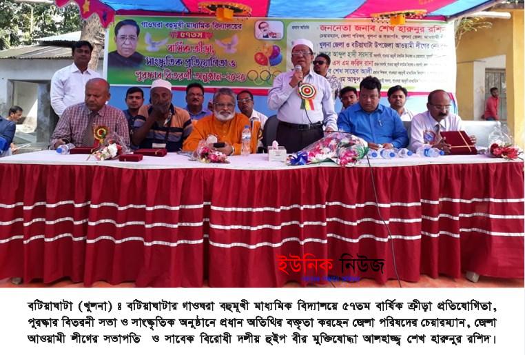 ইন্দ্রজিৎ টিকাদার, বটিয়াঘাটা (খুলনা) : খুলনা জেলা পরিষদের চেয়ারম্যান, জেলা আওয়ামী লীগের সভাপতি ও সাবেক বিরোধী দলীয় হুইপ বীর মুক্তিযোদ্ধা আলহাজ্জ্ব শেখ হারুনুর রশিদ বলেছেন, লেখাপড়ার পাশাপাশি শিক্ষার্থীদের শরীরচর্চা ও খেলাধূলার প্রতিও মনোনিবেশ ঘটাতে হবে। মানসিক উৎকর্ষ সাধনে খেলাধূলার কোন বিকল্প নেই। কারণ অতি মেধাবী শিক্ষার্থীরা ভাল ফলাফল করে যখন সরকারী বেসরকারী পর্যায়ে উচ্চ পদে চাকুরী গ্রহণ করে তখন মানসিক ও শারীরিক দুর্বলতার কারনে সেবা প্রদানে অনাগ্রহ দেখায় শুধু তাই নয়, একজন মেধাবী শিক্ষার্থী যেন পরিবার সমাজ ও দেশের সম্মান বয়ে আনে ঠিক তেমনি একজন কৃতি খেলোয়াড় দেশের সম্মান ও সুনাম বয়ে আনে। সে লক্ষ্যে সরকারের প্রধানমন্ত্রী বঙ্গবন্ধু কন্যা শেখ হাসিনা সে দিকে গুরুত্ব দিয়ে ছাত্র/ছাত্রীদের লেখাপড়ার পাশাপাশি শারীরিক ব্যায়াম ও ক্রীড়ার উপর গুরুত্ব দিয়ে যাচ্ছে। তিনি বুধবার বেলা ১১টায় বটিয়াঘাটার গাওঘরা বহুমূখী মাধ্যমিক বিদ্যালয়ে ৫৭তম বার্ষিক ক্রীড়া প্রতিযোগিতা, পুরস্কার বিতরনী সভা ও সাংস্কৃতিক অনুষ্ঠানে প্রধান অতিথির বক্তৃতায় একথা বলেন। বিদ্যালয় পরিচালনা পরিষদের সভাপতি ইউপি চেয়ারমান আঃ হাদী সরদারের সভাপতিত্বে ও জেলা সৈনিক লীগের সভাপতি সাবেক ছাত্রনেতা এস,এম ফরিদ রানা ও ছাত্রনেতা এস,এম শফিকুল ইসলাম এর যৌথ সঞ্চালনায় অনুষ্ঠিত সভায় বিশেষ অতিথি ছিলেন জেলা আওয়ামী লীগের সাবেক যুগ্ম সাধারণ সম্পাদক শরফুদ্দিন বিশ^াস বাচ্চু, সাংগঠনিক সম্পাদক ও সাবেক যুবলীগ সভাপতি মোঃ কামরুজ্জামান জামাল, ত্রাণ ও সমাজ কল্যান সম্পাদক এড. নিমাই চন্দ্র রায়, আইন বিষয়ক সম্পাদক অতিঃ এপিপি এড. নব কুমার চক্রবর্তী, মাধ্যমিক শিক্ষা কর্মকর্তা নারায়ন চন্দ্র মন্ডল, উপজেলা প্রেসক্লাবের সভাপতি প্রতাপ ঘোষ, সাবেক মুক্তিযোদ্ধা কমান্ডার শেখ আফজাল হোসেন ও প্রধান শিক্ষক শেখ সাহেব আলী। বক্তৃতা করেন কেন্দ্রীয় ছাত্রলীগের সাবেক সহ-সভাপতি নুরুল ইসলাম বাদশা, সাবেক মহিলা ভাইস চেয়ারম্যান বুলু রায় গাঙ্গুলী, জেলা যুবলীগের যুগ্ম সম্পাদক সরদার জাকির হোসেন, তথ্য ও গবেষনা সম্পাদক জামিল খান, তাপস জোয়র্দ্দার, পাপিয়া সরোয়ার, জেলা ছাত্রলীগের সম্পাদক মোঃ ইমরান হোসন, মাহমুদুল হাসান ইমন, তানভীর হোসেন আকাশ, আহসান আহম্মেদ পাভেল, কবিরুল ইসলাম, ফাইমিন সরদার, চিশতি নাজমুল বাশার, শেখ আল-আমিন, শরিফ খান, আ’লীগ নেতা আকরাম হোসেন, রবীন্দ্রনাথ সরকার, রেজাউল বিশ^াস, দেবাশীষ মন্ডল, এস. এম শাহীন আলম, ডাঃ সুব্রত মন্ডল, শাহারা বেগম, শাহাবুদ্দিন গোলদার, রমজান শেখ, হাবিবুর রহমান, সহকারী শিক্ষক মোসলেম উদ্দিন সরদার, আঃ লতিফ সরদার, আঃ রাজ্জাক, মোজাফ্ফর ঢালী, রুনু গোলদার, সোমা বিশ^াস, সুবহান গ