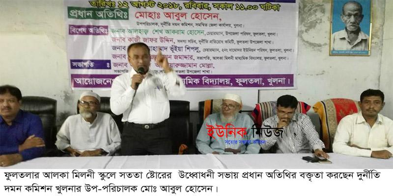 রোববার বেলা ১১টায় ফুলতলার আলকা মিলনী মাধ্যমিক বিদ্যালয়ে “সততা ষ্টোর” উদ্বোধনী অনুষ্ঠানের প্রধান অতিথির বক্তৃতায় তিনি এ কথা বলেন। স্বাগত বক্তৃতা করেন প্রধান শিক্ষক প্রশান্ত কুমার রায়। উপজেলা দুর্নীতি প্রতিরোধ কমিটির সভাপতি আলহাজ্ব আনোয়ারুজ্জামান মোল্যার সভাপতিত্বে অনুষ্ঠিত সভায় বিশেষ অতিথি ছিলেন কমিটির সদস্য সচিব মুক্তিযোদ্ধা কাজী জাফর উদ্দিন, স্কুল পরিচালনা কমিটির সভাপতি মোঃ মনিরুজ্জামান জমাদ্দার, উপজেলা প্রেসক্লাব সভাপতি শামসুল আলম খোকন। শিক্ষক বাসুদেব শীলের পরিচালনায় অন্যান্যের মধ্যে উপস্থিত ছিলেন শিক্ষক শ্যামপদ মন্ডল, রেবা চক্রবর্তী, জয়ন্তিলতা গাইন, শেখ সিরাজুল ইসলাম, মোঃ ইয়াছিন মোল্যা, জোবায়দা খানম, বিজয়কৃষ্ণ হালদার, আছরা খাতুন, জয়দেব বিশ্বাস, লাল্টু পাল প্রমুখ। পরে প্রধান অতিথি ফিতা কেটে সততা ষ্টোরের আনুষ্ঠানিক উদ্বোধন করেন।
