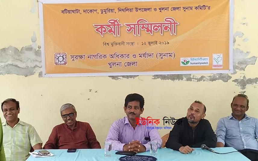 খুলনা : সুরক্ষা, নাগরিক অধিকার ও মর্যাদা (সুনাম) খুলনা জেলা কমিটির আয়োজনে এবং ৪টি উপজেলা বটিয়াঘাটা, দাকোপ, ডুমুরিয়া, দিঘলিয়া উপজেলা কমিটির সমন্বয়ে আজ ১২ জুলাই ২০১৯ শুক্রবার সকাল ১০ টায় স্থানীয় বটিয়াঘাটা বিশ্ব মুক্তিবানী সংস্থা মিলনায়তনে এক কর্মী সম্মিলনী অনুষ্ঠিত হয়। মানবাধিকার সংগঠন শারি ও হিউম্যানিটিওয়াচ এর সহযোগিতায় সুনাম খুলনা জেলা কমিটির সহসভাপতি সাংবাদিক সুনীল দাসের সভাপতিত্বে এবং সাধারণ সম্পাদক মাহমুদ হাসান রনির সঞ্চালনায় কর্মী সম্মিলনীতে অতিথি হিসাবে শারির অ্যাডভোকেসী সমন্বয়কারী রঞ্জন বকশী নুপু, প্রকল্প সমন্বয়কারী বিষ্ণু পদ দাস, হিউম্যানিটিওয়াচের সাধারণ সম্পাদক শরিফুল ইসলাম সেলিম, পিরোজপুর রয়েল বেঙ্গল ফাউন্ডেশনের প্রধান নির্বাহী মইনুল আহসান মুন্না, বাগেরহাট জেলা সুনাম কমিটির সাধারণ সম্পাদক রবীন্দ্রনাথ দেবনাথ। কর্মী সম্মিলনীতে আরো বক্তব্য রাখেন খুলনা জেলা কমিটির প্রভাষক পঞ্চানন মন্ডল, কাজী মাহফুজুর রহমান মুকুল, পলাশ দাশ, প্রভাষক এস এম সোহেল ইসহাক, সাংবাদিক রিংটন মন্ডল, জগন্মাথ কর্মকার, জি এম রাসেল ইসলাম, ডুমুরিয়া সুনাম কমিটির রিপন দাস, দিঘলিয়ার বেনজির আহমেদ মুকুল, মিনহাজুল ইসলাম রাজন, দাকোপ উপজেলার সাগর সেন, পুষ্পেন মন্ডল এবং বটিয়াঘাটা উপজেলা সুনাম কমিটির অরোজিত বিশ্বাস ও সুরঞ্জিত সরদার প্রমুখ:। এসময় খুলনা জেলা সুনাম কমিটি ৪ উপজেলা সুনাম কমিটির ২ জন করে সেরা ৮ জন কর্মীকে এবং শারি’কে বিশেষ সম্মাননা প্রদান করেন।