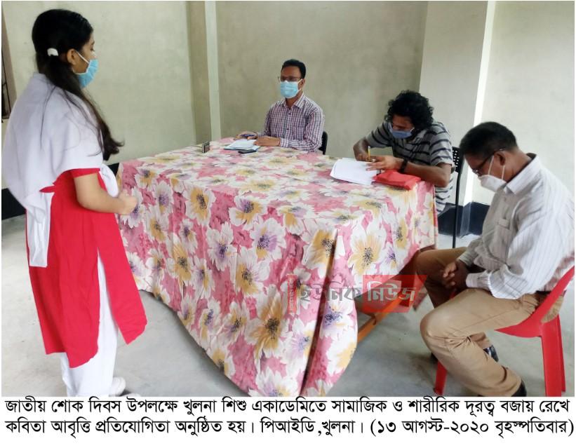 খুলনা অফিস : হাজার বছরের শ্রেষ্ঠ বাঙালি ও স্বাধীনতার মহান স্থপতি জাতির পিতা বঙ্গবন্ধু শেখ মুজিবুর রহমানের ৪৫তম শাহাদত বার্ষিকী ও জাতীয় শোক দিবস উপলক্ষে বাংলাদেশ শিশু একাডেমি খুলনা জেলা কার্যালয়ে আজ (বৃহস্পতিবার) সকালে কবিতা আবৃত্তি প্রতিযোগিতা অনুষ্ঠিত হয়।