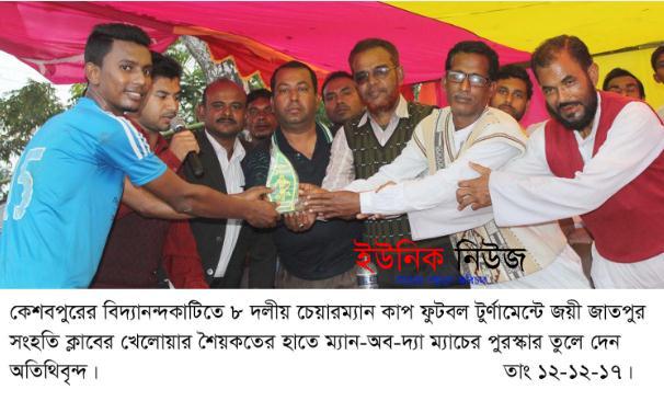 কেশবপুর (যশোর) প্রতিনিধি : যশোরের কেশবপুর উপজেলার বিদ্যান্দকাটি ইউনিয়ন পরিষদ মাঠে মঙ্গলবার বিকালে ৮ দলীয় চেয়ারম্যান কাপ ফুটবল টুর্ণামেন্টের ৩য় খেলায় জাতপুর সংহতি ক্লাব ১-০ গোলে মিকশিমিল ফুটবল একাদশকে পরাজিত করে জয়লাভ করে। বিদ্যানন্দকাটি ইউনিয়ন আওয়ামী লীগের যুগ্ম-আহ্বায়ক জি.এম. হাফিজুর রহমানের সভাপতিত্বে ও মাষ্টার রফিকুল ইসলামের সঞ্চালনায় প্রধান অতিথির বক্তব্য রাখেন বিদ্যানন্দকাটি ইউনিয়ন আওয়ামী লীগের যুগ্ম-আহ্বায়ক রওশন আলী সরদার। বিশেষ অতিথির বক্তব্য রাখেন প্রবীণ আওয়ামী লীগ নেতা হাসেম আলী শেখ ও উপজেলা প্রেসক্লাবের সভাপতি এস আর সাঈদ। বক্তব্য রাখেন ইউপি সদস্য সোকানুর রহমান, যুবলীগ নেতা ফারুক হোসেন প্রমুখ। খেলা পরিচালনা করেন রাজু আহম্মেদ, আতিয়ার রহমান ও শওকত আলী। খেলায় জাতপুর সংহতি ক্লাবের খেলোয়ার শৈকত ম্যান-অব-দ্যা ম্যাচ নির্বাচিত হন। উল্লেখ্য বিদ্যান্দকাটি ইউনিয়ন পরিষদের চেয়ারম্যান আমজাদ হোসেন উক্ত ফুটবল টুর্ণামেন্টের আয়োজন করেছেন।