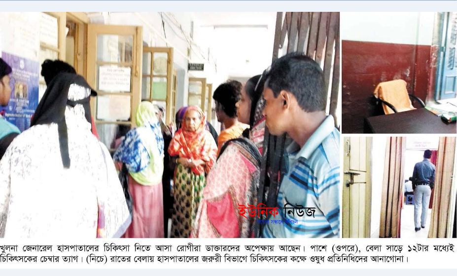 মঙ্গলবার সকাল ৯টা ২২ মিনিট। মেডিসিন বিশেষজ্ঞ কনস্যালট্যান্ট ডাঃ উৎপল কুমার চন্দ। রুম নং-২২। তার রুমের সামনে চিকিৎসাসেবা নিতে দাঁড়িয়ে আছেন রোগীরা। কিন্তু ডাক্তারের খোঁজ নেই। হাসপাতালে চিকিৎসা নিতে আসা জীবনকৃষ্ণ জানান, তিনি রূপসা উপজেলা নন্দনপুর এলাকার বাসিন্দা। কয়েকদিন ধরে জ্বর ও গায়ে ব্যথা না কমায় ডাক্তার দেখাতে আসছি। কিন্তু ডাক্তার না আসায় অপেক্ষার প্রহর গুণছেন। বহিঃবিভাগে অর্থো-সার্জারি মেডিকেল অফিসার ডাঃ কাজী মঈনুর রহমান। তাকেও নির্দিষ্ট সময়ের মধ্যে তার চে¤¦ারে উপস্থিত হতে দেখা যায়নি। শিশু কনসালটেন্ট ডাঃ মোঃ হাফিজুর রহমান। সোয়া ৯টার অনেক পরে তার চেম্বারে বসেন। এক এক করে রোগী দেখছেন। তখনও কনসালটেন্ট শিশু বিশেষজ্ঞ ডাঃ শরাফাত হোসাইন হাসপাতালে উপস্থিত হননি। তিনি ১১টার পর ছাড়া রোগী দেখেন না। আসেনও দেরিতে। সাড়ে ১২টা বাজতে না বাজতে ডাঃ হাফিজুর রহমান চেম্বার ত্যাগ করেন। পাশাপাশি ডাঃ এসএম মুরাদও চেম্বার ত্যাগ করেন। ওই সময় শিশু বিশেষজ্ঞ চিকিৎসক ডাঃ শরাফাত হোসাইন রোগী দেখছেন। কর্তব্যরত নার্সরা এ প্রতিবেদককে জানান, তিনি ছিলেন তো এখন দেখিনা। স্যাররা তো আমাদের বলে যান না। হাসপাতালে চিকিৎসাসেবা নিতে ১২টা ২৫ মিনিটে পুরুষ বহিঃবিভাগে টিকিট নিতে আসেন নগরীর টুটপাড়া এলাকার বাসিন্দা শামীম হোসেন। ওই সময় টিকিট কাউন্টারে কর্তব্যরত নার্সরা সাফ জানিয়ে দেন, এখন আর টিকিট হবে না। ডাক্তার নেই, আপনি জরুরি বিভাগে চলে যান। ডাক্তার কতক্ষণ পর্যন্ত থাকবেন এমন প্রশ্ন করা হলে, তেলেবেগুনে জ্বলে ওঠেন। ধমকের সুরে বলেন, এখন কোন টিকিট হবে না।