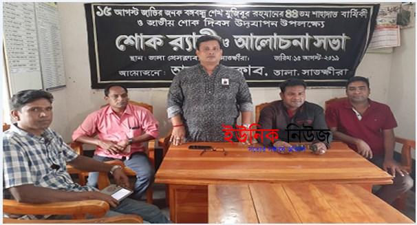 তালা প্রতিনিধি : জাতির জনক বঙ্গবন্ধু শেখ মুজিবুর রহমানের ৪৪ তম শাহাদাত বার্ষিকী ও জাতীয় জাতীয় শোক দিবসে তালা প্রেসক্লাবে এক আলোচনা সভা অনুষ্ঠিত হয়েছে। জাতীয় শোক দিবস উপলক্ষে ( ১৫ আগষ্ট) বৃহস্পতিবার সককালে তালা প্রেসক্লাবের সভাপতি প্রণব ঘোষ বাবলুর সভাপতিত্বে সভায় বক্তব্য রাখেন উপজেলা ভাইস চেয়ারম্যান ও তালা প্রেসক্লাবের সাধারণ সম্পাদক সরদার মশিয়ার রহমান,প্রেসক্লাবের সহ-সভাপতি গাজী জাহিদুর রহমান,সহ-সভাপতি নজরুল ইসলাম,সাংগঠনিক সম্পাদক সেলিম হায়দার,দপ্তর সম্পাদক শফিকুল ইসলাম,অর্থ সম্পাদক এমএ ফয়সাল,সব্যসাচী মজুমদার বাপ্পী,কাজী লিয়াকত হোসেন প্রমুখ। এর আগে তালা প্রেসক্লাবের নেতৃবৃন্দ শোক র্যালী ও জাতীর জনক বঙ্গবন্ধু প্রতিকৃতিতে ফুল দিয়ে শ্রদ্ধা নিবেদন করেন।