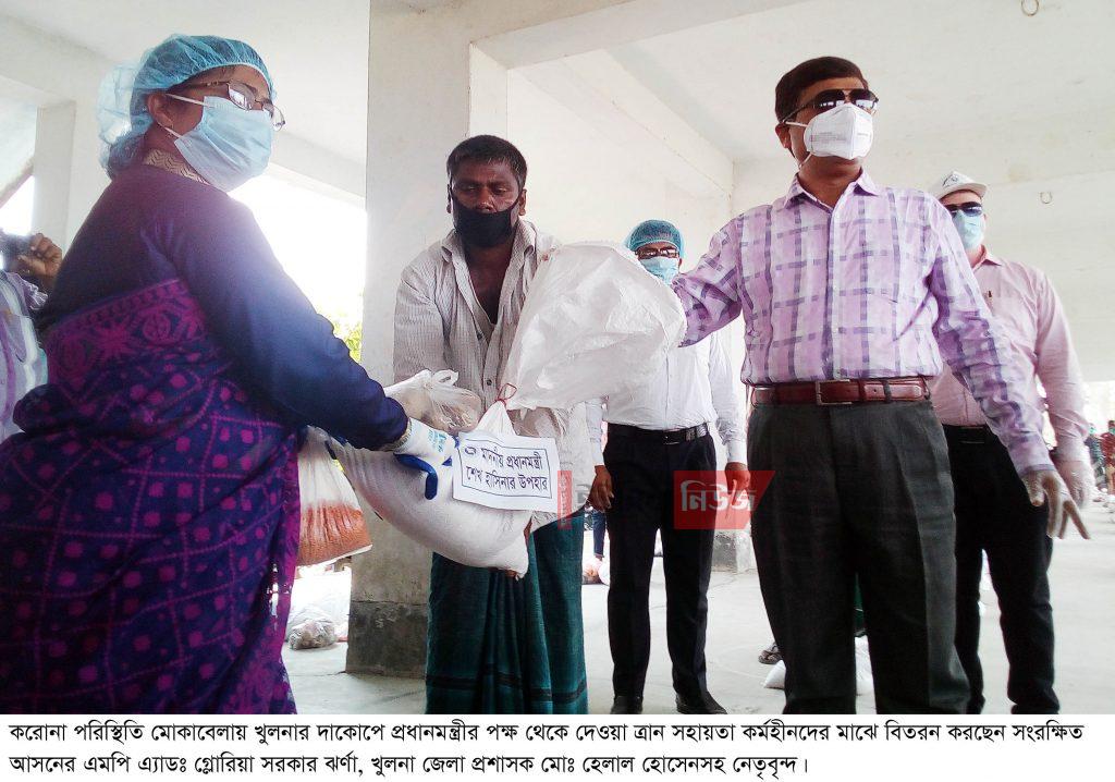 বুধবার বেলা ১২ টায় খুলনার দাকোপ উপজেলাধীন লাউডোপ বুড়িরডাবুর মাধ্যমিক বিদ্যালয় চত্বরে প্রধানমন্ত্রী শেখ হাসিনার পক্ষ থেকে কর্মহীন দরিদ্র পরিবারে দেওয়া খাদ্য সহায়তা বিতরন অনুষ্ঠানে সংরক্ষিত আসনের এমপি এ্যাডঃ গ্লোরিয়া সরকার ঝর্ণা এ কথা বলেন। অনুষ্ঠানে খুলনা জেলা প্রশাসক মোঃ হেলাল হোসেন বলেন, দেশের কোন মানুষ যাতে খাদ্য অভাবে না থাকে তার জন্য সরকার কাজ করে যাচ্ছে। তিনি ত্রান বিতরনে কোন দূর্ণীতি অনিয়ম সরকার সহ্য করবেনা উল্লেখ করে বলেন, সমাজের এক শ্রেণীর মানুষ আছে যারা ত্রান চাইতে অভ্যাস্ত না কিন্তু তারা খাদ্য সংকটে আছে, এমন মানুষদের ঘরে খাদ্য পৌছে দিতে হবে। এ সময় অন্যান্যের মধ্যে উপস্থিত ছিলেন খুলনার পুলিশ সুপার এস এম শফিউল্লাহ, দাকোপ উপজেলা চেয়ারম্যান মুনসুর আলী খান, উপজেলা নির্বাহী অফিসার আব্দুল ওয়াদুদ, উপজেলা সহকারী কমিশনার ভূমি তারিফ উল হাসান, দাকোপ থানার অফিসার ইনচার্জ সফিকুল ইসলাম চৌধুরী, উপজেলা ভাইস চেয়ারম্যান গৌরপদ বাছাড়, মহিলা ভাইস চেয়ারম্যান খাদিজা আকতার, ইউপি চেয়ারম্যান সরোজিত রায়, মিহির মন্ডল, উপজেলা প্রকল্প বাস্তবায়ন কর্মকর্তা শেখ আব্দুল কাদেরসহ উপজেলার বিভিন্ন দাপ্তরিক কর্মকর্তা ও স্থানীয় জনপ্রতিনিধিবৃন্দ। অনুষ্ঠানে প্রধানমন্ত্রীর পক্ষ থেকে লাউডোপ ও কৈলাশগঞ্জ ইউনিয়নের ১০০ পরিবারের মাঝে পরিবার প্রতি ১০ কেজি চাল, ২ কেজি আলু, ১ কেজি ডাল ও ১ পিচ করে সাবান বিতরন করা হয়।