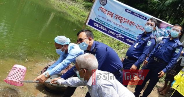 মনোজ রায় হিরু, আটোয়ারী : পঞ্চগড়ের আটোয়ারী থানা ক্যাম্পাসে অবস্থিত পুকুরে পোনামাছ অবমুক্ত করলেন পঞ্চগড়ের পুলিশ সুপার মোহামদ ইউসুফ আলী। আটোয়ারী থানা পুলিশের আয়োজনে সোমবার (১৫জুন) সকালে তিনি প্রধান অতিথি হিসেবে উপস্থিত থেকে পোনামাছ অবমুক্ত করেন। এসময় বিশেষ অতিথি হিসেবে পঞ্চগড়ের অতিরিক্ত পুলিশ সুপার (প্রশাসন) ও সদ্য পুলিশ সুপার পদে পদোন্নতী প্রাপ্ত নাঈমুল হাসান, অতিরিক্ত পুলিশ সুপার (সদর সার্কেল) সুদর্শন কুমার রায় এবং আটোয়ারী উপজেলা পরিষদের চেয়ারম্যান মো: তৌহিদুল ইসলাম উপস্থিত ছিলেন। সাব ইনস্পেক্টর শাহীনুর ইসলাম সিদ্দিকীর পরিচালনায় অনুষ্ঠানে অন্যান্যের মধ্যে আরও উপস্থিত ছিলেন আটোয়ারী থানার অফিসার ইনচার্জ মো: ইজার উদ্দীন, ওসি (তদন্ত) জয়ন্ত কুমার সাহা, উপজেলা আওয়ামীলীগের সাংগঠনিক সম্পাদক মো: এমদাদুল হক সহ স্থানীয় সংবাদ প্রতিনিধিরা। উল্লেখ্য, থানা পুকুরে প্রথম পর্যায় বিভিন্ন প্রজাতির প্রায় ৩৯ কেজি মাছ অবমুক্ত করা হয়।
