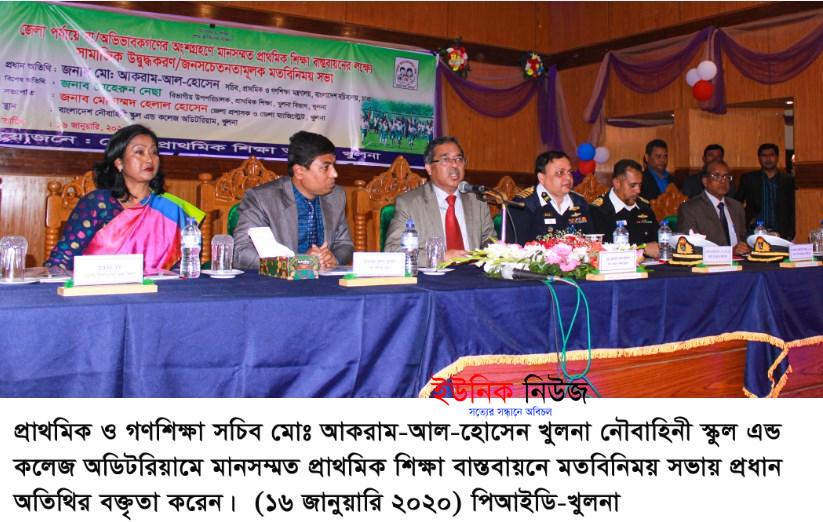 প্রাথমিক ও গণশিক্ষা সচিব মোঃ আকরাম-আল-হোসেন আজ (বৃহস্পতিবার) দুপুরে খুলনা নৌবাহিনী স্কুল এন্ড কলেজ অডিটরিয়ামে মানসম্মত প্রাথমিক শিক্ষা বাস্তবায়নে জেলা পর্যায়ে শিক্ষার্থীদের অভিভাবকদের অংশগ্রহণে সামাজিক উদ্বুদ্ধকরণ মতবিনিময় সভার প্রধান অতিথির বক্তৃতায় এসব কথা বলেন।