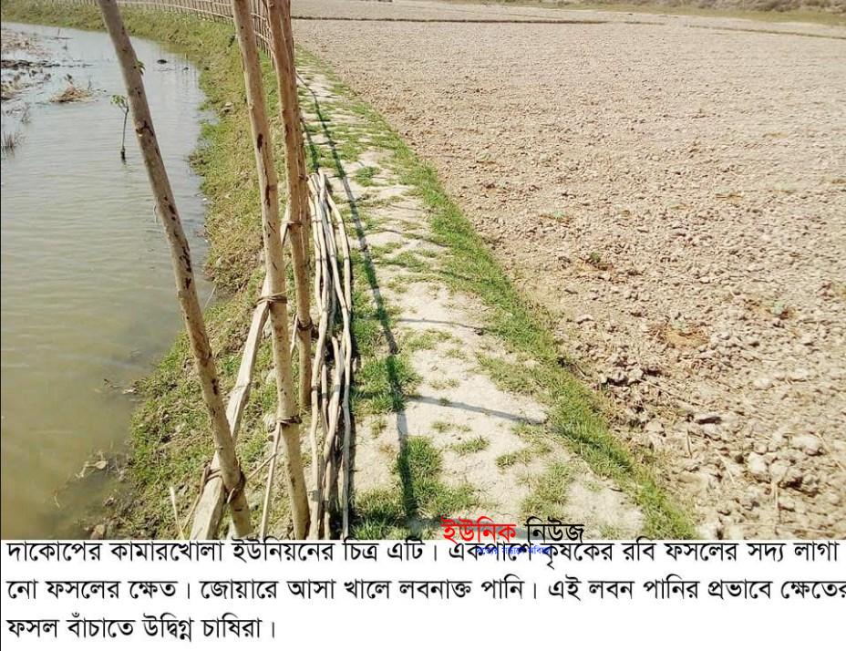 এক সময় যেখানে বছরে একটি মাত্র ফসল আমন ধানের উপর নির্ভর করতে হত এখন সেখানে অনেক প্রতিকুলতার মাঝে কৃষকরা ফলাচ্ছে ২/৩ ফসল। দাকোপের কৃষি ভান্ডারখ্যাত বাজুয়া দাকোপসহ ৫ টি ইউনিয়নের ন্যায় উপজেলার কামারখোলা ইউনিয়ন ধীরে ধীরে কৃষি উৎপাদনে এগিয়ে যাচ্ছে। চলতি বছর সেখানে প্রায় ৩ হাজার বিঘা জমিতে গরমের ধান, তরমুজ, আলু, ভুট্রা, ঝিঙে, ঢেড়শ, উচতে, বাঙ্গি, মিষ্টি কুমড়ো, গম, তিল, সূর্যমূখী, বাদামসহ বিভিন্ন ধরনের শাক সব্জির চাষাবাদ করা হয়েছে। কিছু দিন আগে রোপনকৃত বীজ থেকে চারা গুলো কেবলই মাথা উচু করে দাড়াচ্ছে। এমনই মুহুর্তে লবন পানির ছোয়াতে চারার অবস্থা খারাপ হয়ে গেছে। অনেক কৃষকের ক্ষেতের চারা লবনের প্রভাবে মরেই গেছে। জানা গেছে কালীনগরে পাউবোর স্লুইজ গেটের নষ্ট ঢাকনা দিয়ে দিনরাত নদীর লবন পানি ওঠা নামা করছে। গত বৃহস্পতিবার জোয়ারের চাপ বেশী হওয়ায় লবন পানি কৃষকের ক্ষেতে উঠে যায়। কৃষক বাঁচাতে গেট সংস্কারে পানি উন্নয়ন বোর্ডকে একাধীকবার বলেও সুফল মেলেনি এমন দাবী তাদের। সাহারাবাদ গ্রামের আশরাফ সানা, মহাজনি সুদে টাকা নিয়ে ২ বিঘে জমিতে রবি ফসলের চাষ করেছিল। এক জোয়ারের পানিতে তার সেই চারাগাছ মরার পথে। সাতঘরিয়া গ্রামের বিপুল মন্ডলের ৪ বিঘা এবং একই গ্রামের মনোরঞ্জন মন্ডলের সাড়ে ৩ বিঘা জমির তরমুজ ধানসহ রবি ফসল মরার উপক্রম। ইউনিয়নের প্রথম এবং সফল চাষি কালীনগর গ্রামের কৃষ্ণপদ ঘোরামী। এবার ২০ বিঘা জমিতে চাষাবাদ করেছেন। তিনি বলেন পর্যাপ্ত মিষ্টি পানির আধার না থাকায় অনেক প্রতিকুলতার মাঝে আমাদের ফসল ফলাতে হয়। তার মাঝে এভাবে ওয়াপদার গেট দিয়ে লবন পানি উঠতে থাকলে কৃষক বাঁচবেনা। এ ব্যাপারে কামারখোলা ইউপি চেয়ারম্যান পঞ্চানন মন্ডল বলেন, দূর্যোগে ক্ষতিগ্রস্থ এই ইউনিয়নের মানুষ কঠোর পরিশ্রম করে এক ফসলী জমিকে ২/৩ ফসল ফলিয়ে বেঁচে থাকার চেষ্টা করছে। কিন্তু এই গেটের লবন পানি তাদের ফসল উৎপাদনে বাঁধা হয়ে দাড়িয়েছে। তিনি বলেন শত শত কোটি টাকা ব্যয়ে বাঁধ নির্মান হচ্ছে কিন্তু কোথাও স্লুইজ গেট নেই। আবার বার বার তাগাদা দিয়েও পুরানো গেট গুলো সংস্কার করানো যাচ্ছেনা। তিনি কৃষক বাঁচাতে অবিলম্বে গেট সংস্কার এবং কামারগোদা, পাচুরদোয়ানী ও নলিয়ান নদী ইজারামুক্ত রেখে মিষ্টি পানির আঁধার সৃষ্টিতে প্রয়োজনীয় ব্যবস্থা গ্রহনে কৃষি ও ভূমিমন্ত্রীসহ সংশ্লিষ্টদের দৃষ্টি আকর্ষন করেছেন।