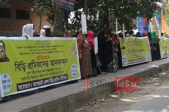 মোল্লাহাট (বাগেরহাট) প্রতিনিধি : বিড়ি উৎপাদন ও বিক্রয় বন্ধ করতে চিঠির প্রতিবাদসহ পাঁচ দফা দবীতে মোল্লাহাটে মানববন্ধন করেছে বাগেরহাট জেলা বিড়ি শ্রমিক ইউনিয়ন। শুক্রবার সকাল ১০টায় উপজেলা পরিষদের সামনের সড়কে ওই মানববন্ধন অনুষ্ঠিত হয়। ওই মানববন্ধনে লিখিত বক্তব্যে প্রকাশ, বিড়ি শিল্পে প্রায় বিশ লক্ষ শ্রমিক রয়েছে। যা বিবেচনা করে গরীব দুঃখী মানুষের শ্রমবান্ধব জননেত্রী প্রধামন্ত্রী শেখ হাসিনা গত ২০০৯-১০ অর্থ বছরের বাজেট বক্তৃতায় বলেছিলেন, বিড়ি সাধারণত গরিব মানুষ ব্যবহার করে এবং গরিব ও সাধারণ মানুষ এখানে কাজের সুযোগ পায়। পক্ষান্তরে সাবের হোসেন চৌধূরী গত ৫তারিখে স্বাস্থ্যমন্ত্রীকে চিঠি দিয়েছেন বিড়ি উৎপাদন ও বিক্রি বন্ধের জন্য। সাবের হোসেন চৌধূরীর উক্ত চিঠির প্রতিবাদ করেন শ্রমিক নেতৃবৃন্দ। এছাড়া তাদের পাঁচ দফা দাবী সমূহ হলো ঃ-১. বিড়ির উপর সকল প্রকার কর প্রত্যাহার করতে হবে। ২. ভারতের ন্যায় বিড়ি শিল্পকে কুটির শিল্প ঘোষণা করতে হবে। ৩. যতদিন বিড়ি শ্রমিকদের বিকল্প কাজের ব্যবস্থা না করা হবে, ততোদিন বিড়ি শিল্পতে কোন প্রকার শুল্ক বৃদ্ধি করা যাবেনা। ৪. উচ্চস্তরের সিগারেটের মূল্য ও সম্পূরক শুল্ক অধিক হারে বৃদ্ধি করতে হবে এবং ৫.কম দামী ও বেশি দামী সিগারেটে সম্পূরক শুল্ক বুদ্ধি করতে হবে।